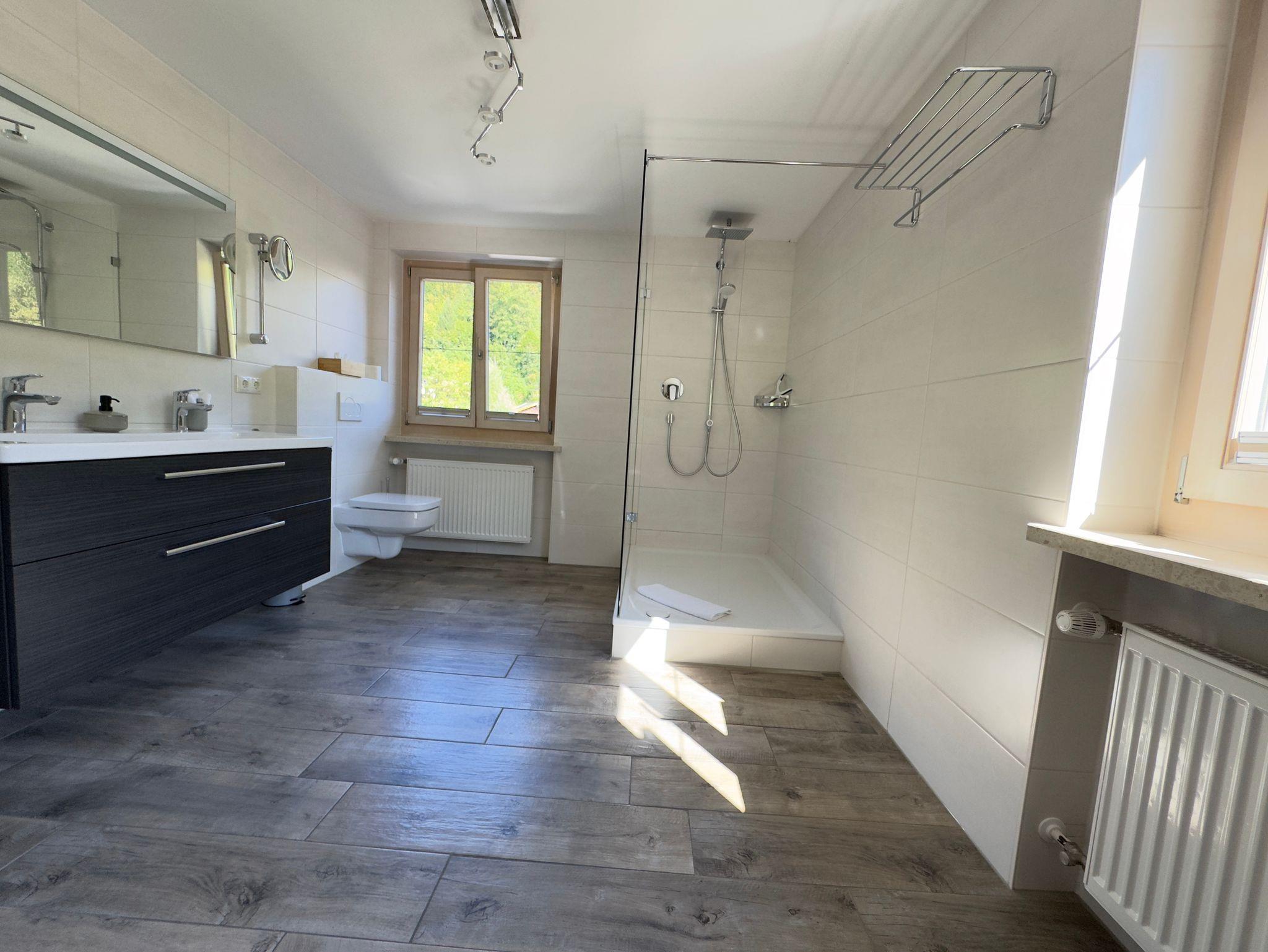 Die Badezimmer haben alle eine Dusche. Das New Eagle Doppelzimmer und unser Hochthron hat zusätzlich je eine Badewanne.