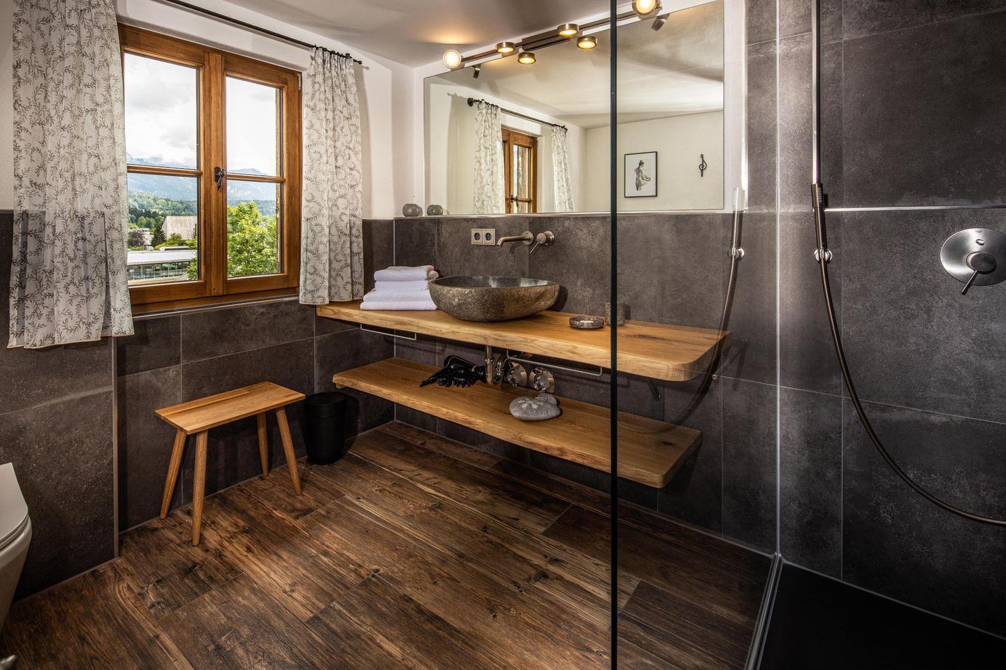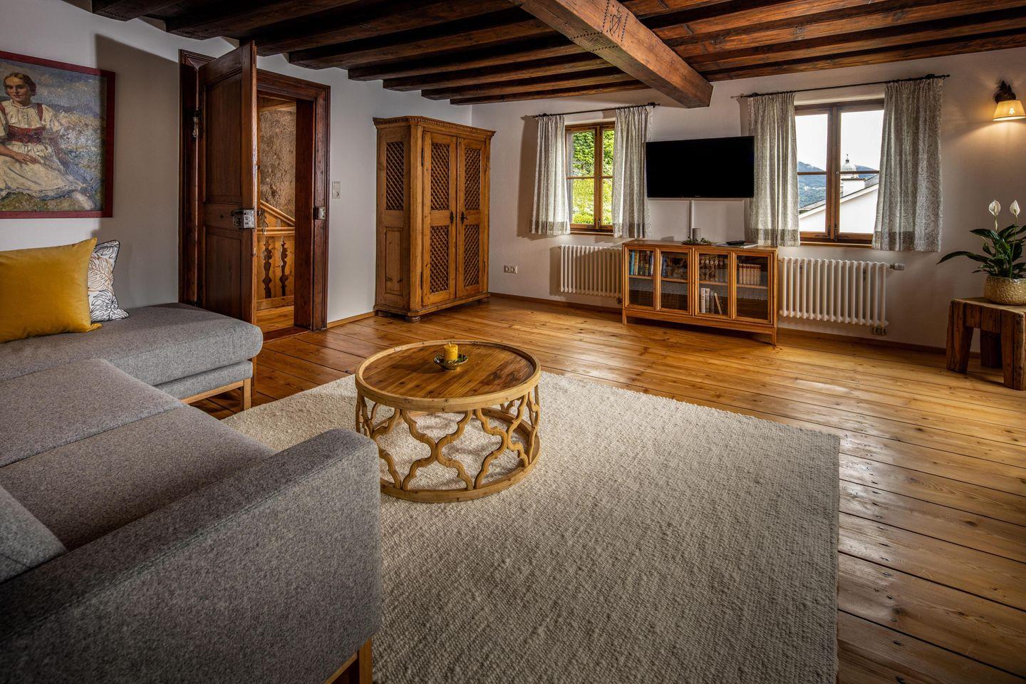 Im großen Wohnzimmer mit Flachbild-TV lädt die Lodencouch und eine Relaxliege zum gemütlichen Fernsehen oder Lesen nach einem erlebnisreichen Tag in Berchtesgaden ein. Das Zusammenspiel aus historischen Bauteilen wie der Holztramdecke aus dem Jahr 1631 und dem modernem Einrichtungsstil schafft eine ganz besondere Atmosphäre und ein einmaliges Wohngefühl.