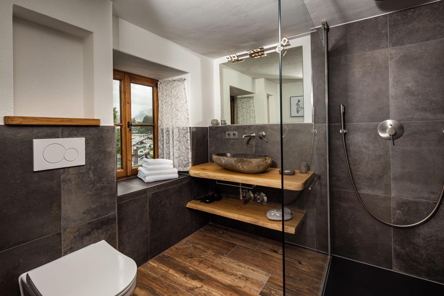 Das moderne Tageslicht-Badezimmer mit großzügiger begehbarer Dusche verfügt über eine Fußbodenheizung, Handtuchtrockner und ein hochwertiges Naturstein-Waschbecken. Zusätzlich zum WC im Badezimmer ist noch ein weiteres separates WC im Eingangsbereich der Wohnung verfügbar.