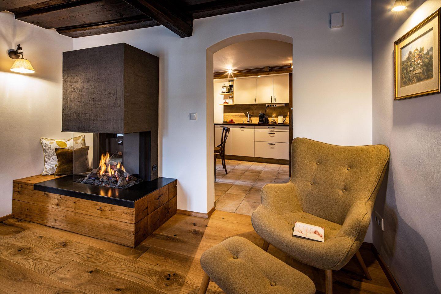 Im Wohnzimmer mit großem Flachbild-TV lädt die Lodencouch und eine Relaxliege zum gemütlichen Fernsehen oder Lesen nach einem erlebnisreichen Tag in Berchtesgaden ein. Das Zusammenspiel aus historischen Bauteilen wie der Holztramdecke, den alten Füllungstüren und dem modernen Einrichtungsstil schafft eine ganz besondere Atmosphäre und ein einmaliges Wohngefühl.