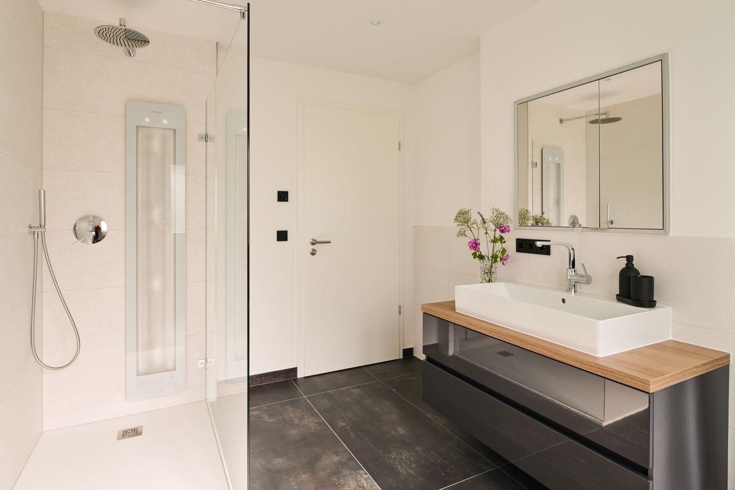 Ein besonderes Highlight ist das Badezimmer: Die bodengleiche Dusche ist mit einer integrierten Sunshower ausgestattet – wohltuendes Infrarotlicht und warmes Wasser bieten hier ein ganz besonderes Wellness-Erlebnis nach einem aktiven Tag in der Berchtesgadener Bergwelt. Niedrig dosiertes UV-Licht unterstützt die natürliche Produktion von Vitamin D.