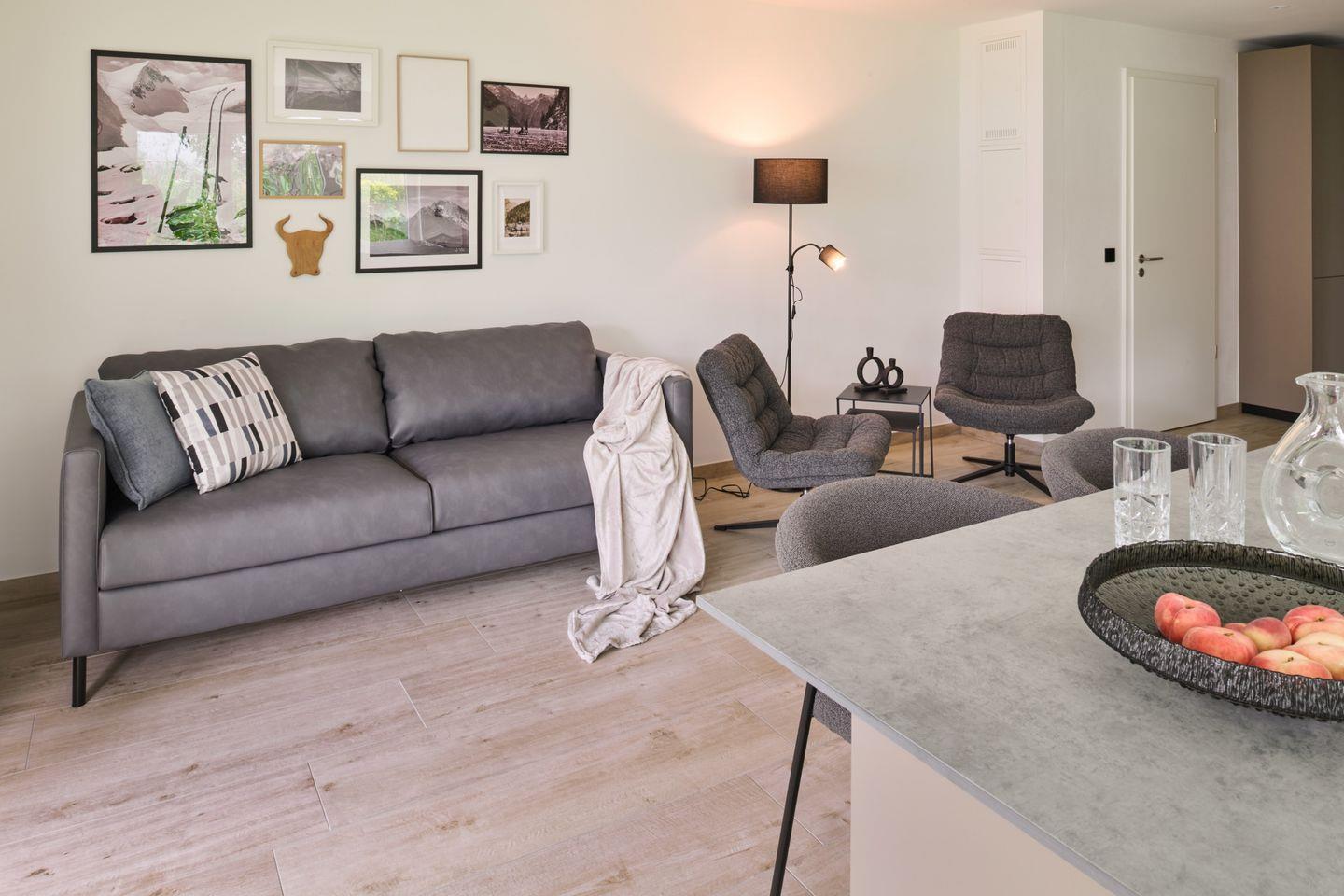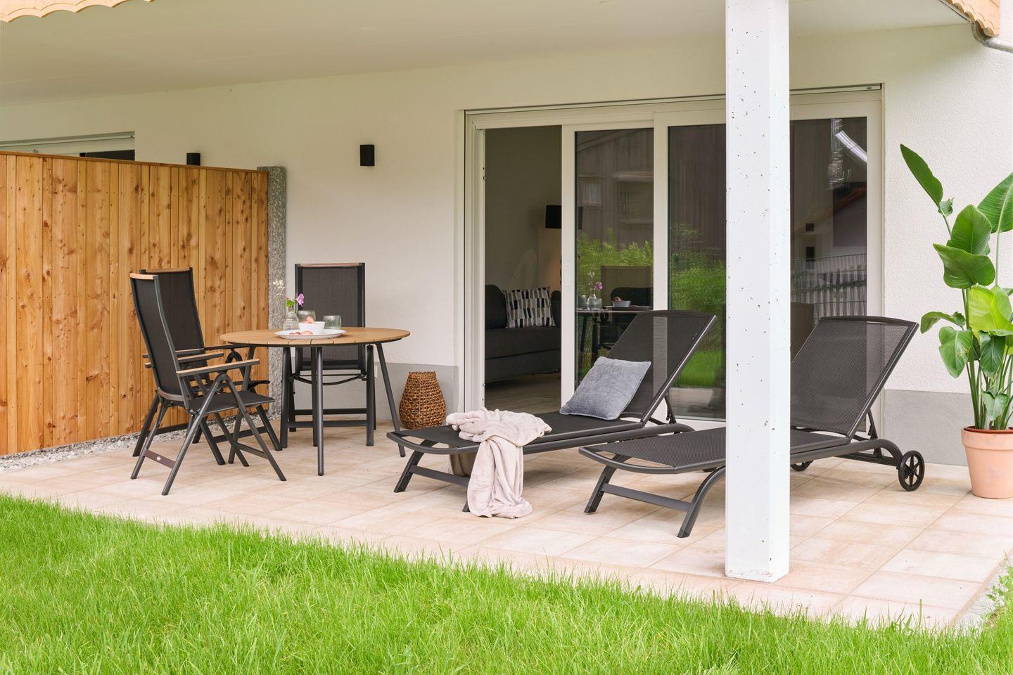 Die helle Wohnung für zwei Personen und maximal ein Kind befindet sich im Erdgeschoss eines neu erbauten Mehrfamilienhauses und besticht durch großzügige Räumlichkeiten, eine sonnige möblierte Terrasse und modernes Design.
