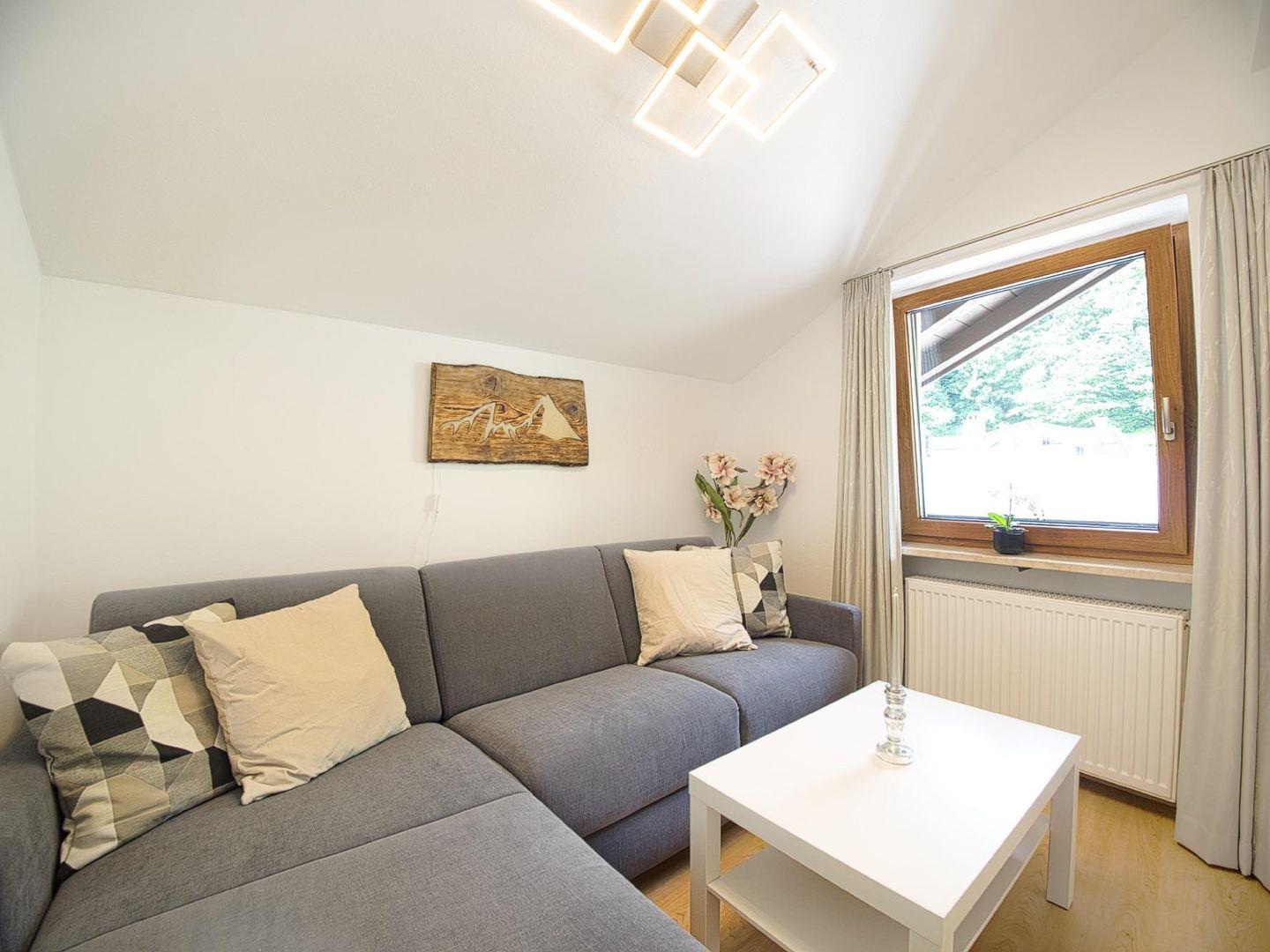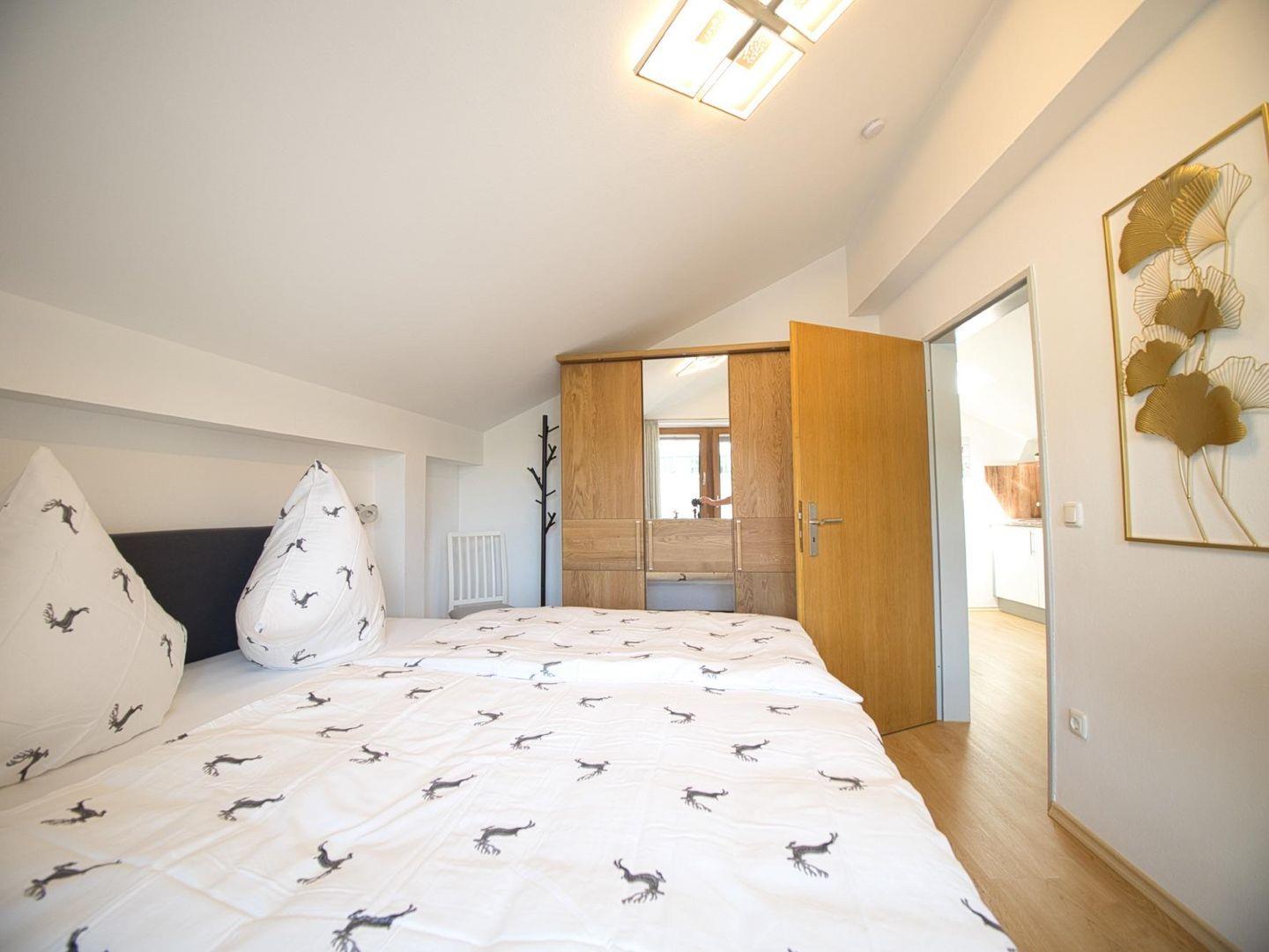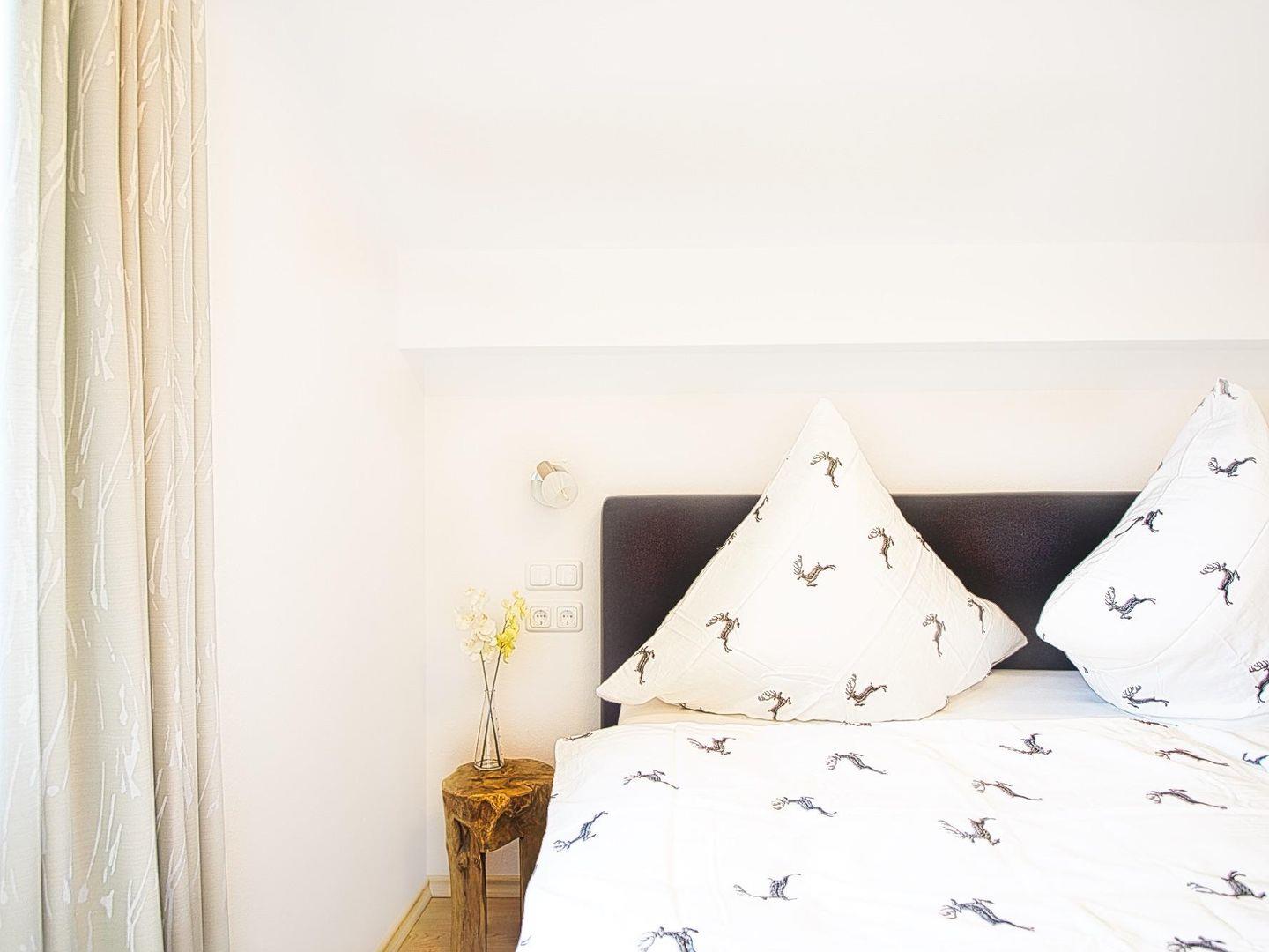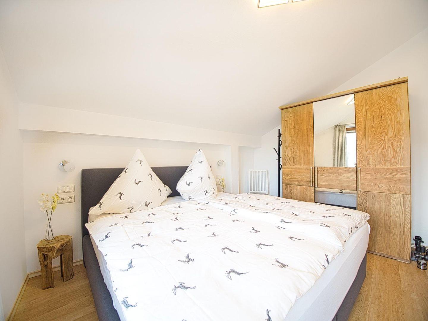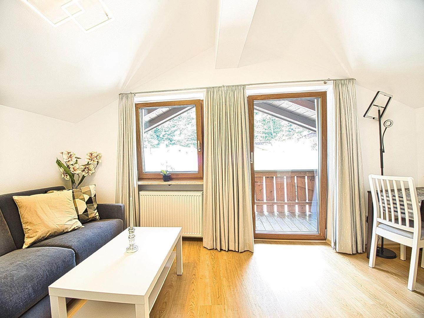 Auf 45 m² Wohnfläche bietet die hochwertig ausgestattete Ferienwohnung alles, was man für einen unkomplizierten Aufenthalt braucht. Das helle Schlafzimmer mit Doppelbett öffnet sich zu einem Balkon mit Blick auf die umliegende Bergwelt – ein schöner Start in den Tag. Der Wohnbereich mit gemütlichem Schlafsofa verfügt über einen zweiten Balkon, der zusätzlichen Raum im Freien schafft.