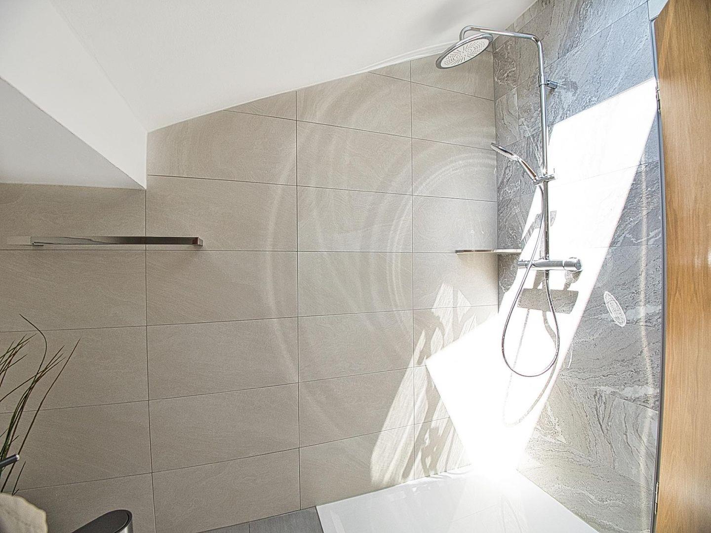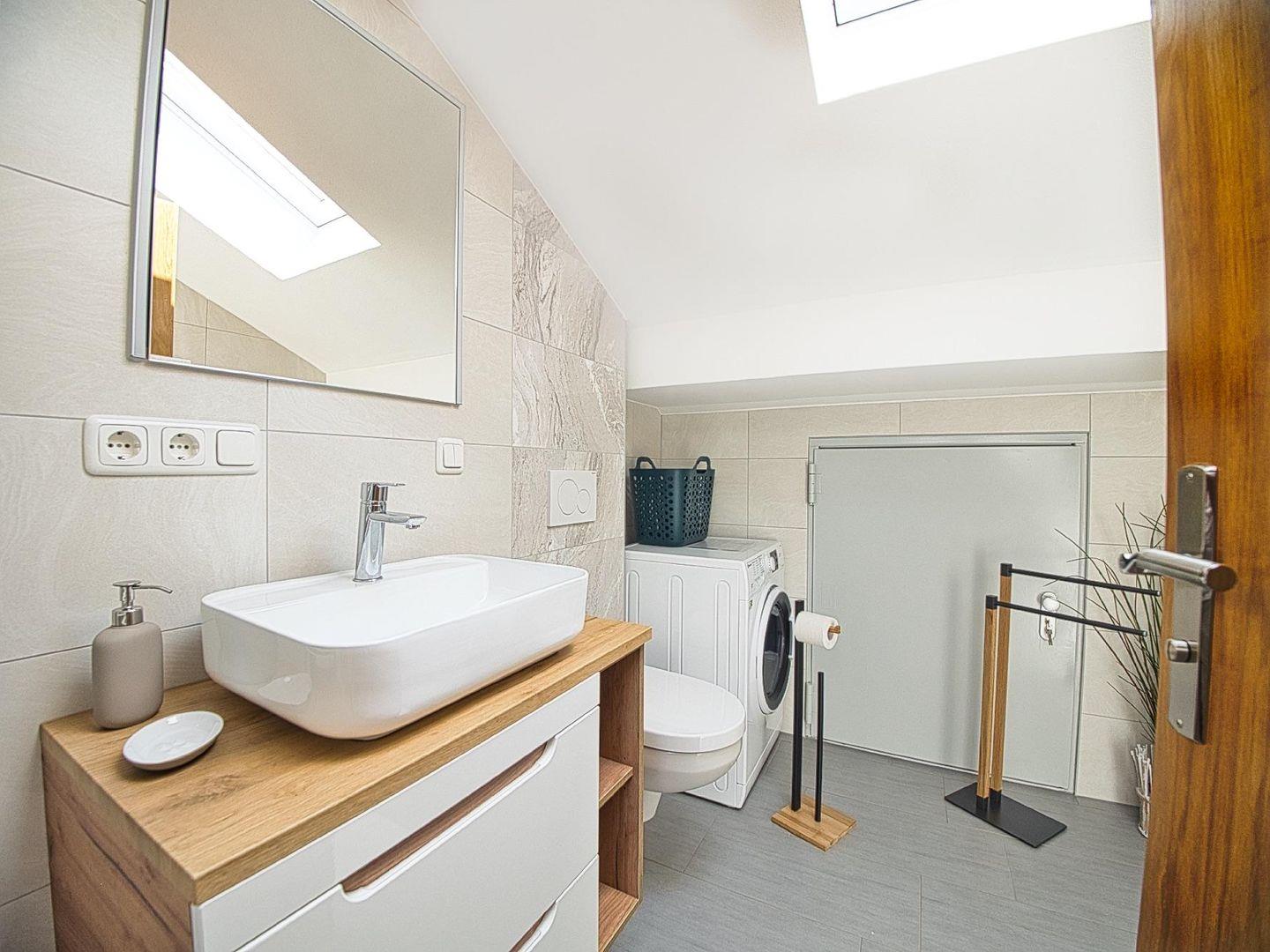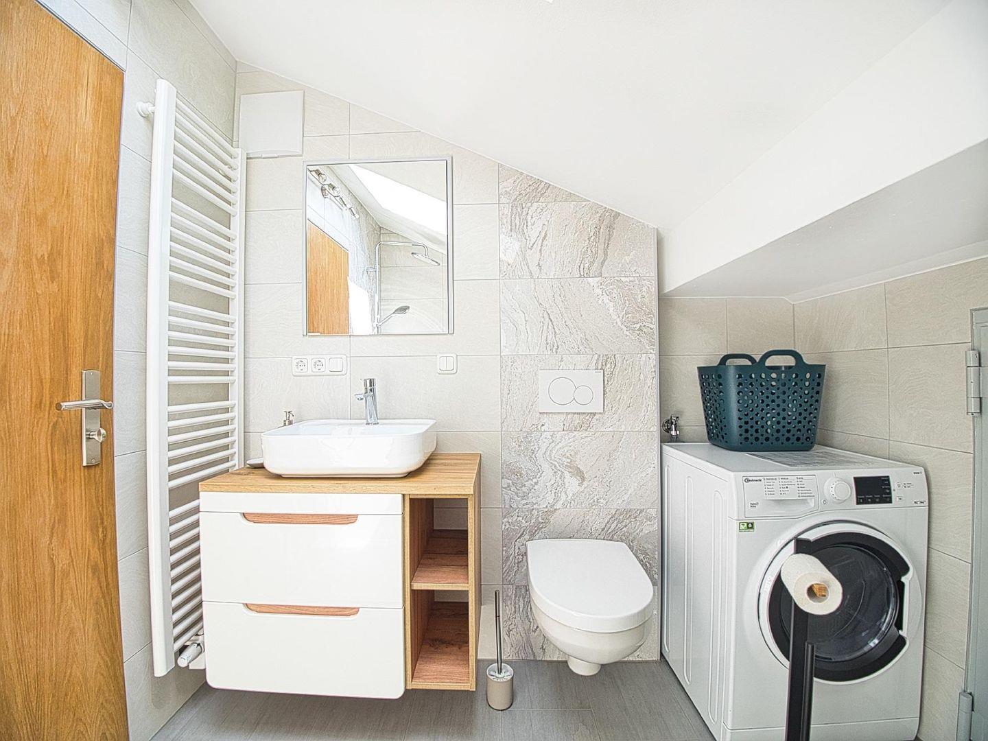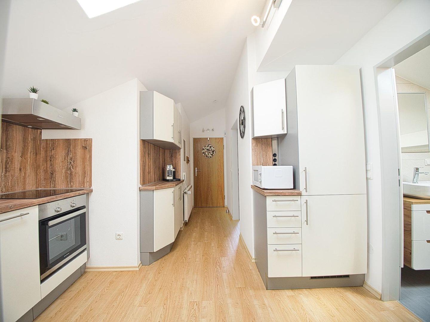Die offen gestaltete Küche ist vollständig ausgestattet und geht fließend in den Essbereich über – ideal für gemeinsame Mahlzeiten nach einem aktiven Tag. Das moderne Badezimmer verfügt über eine großzügige Dusche sowie Waschmaschine mit integriertem Trockner, was die Wohnung auch für längere Aufenthalte oder Workation attraktiv macht. Schnelles Internet und Smart-TV sind selbstverständlich vorhanden.