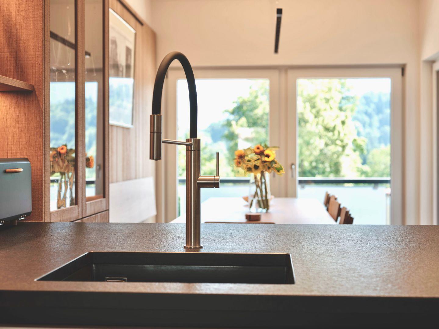 Herzstück ist die Kücheninsel: Die hochwertige Ausstattung mit Miele und Bora bietet beste Voraussetzungen für ambitioniertes gemeinsames Kochen, Aperitif an der Bar und lange, genussvolle Abende an einem der zwei Tische, drinnen oder draußen.