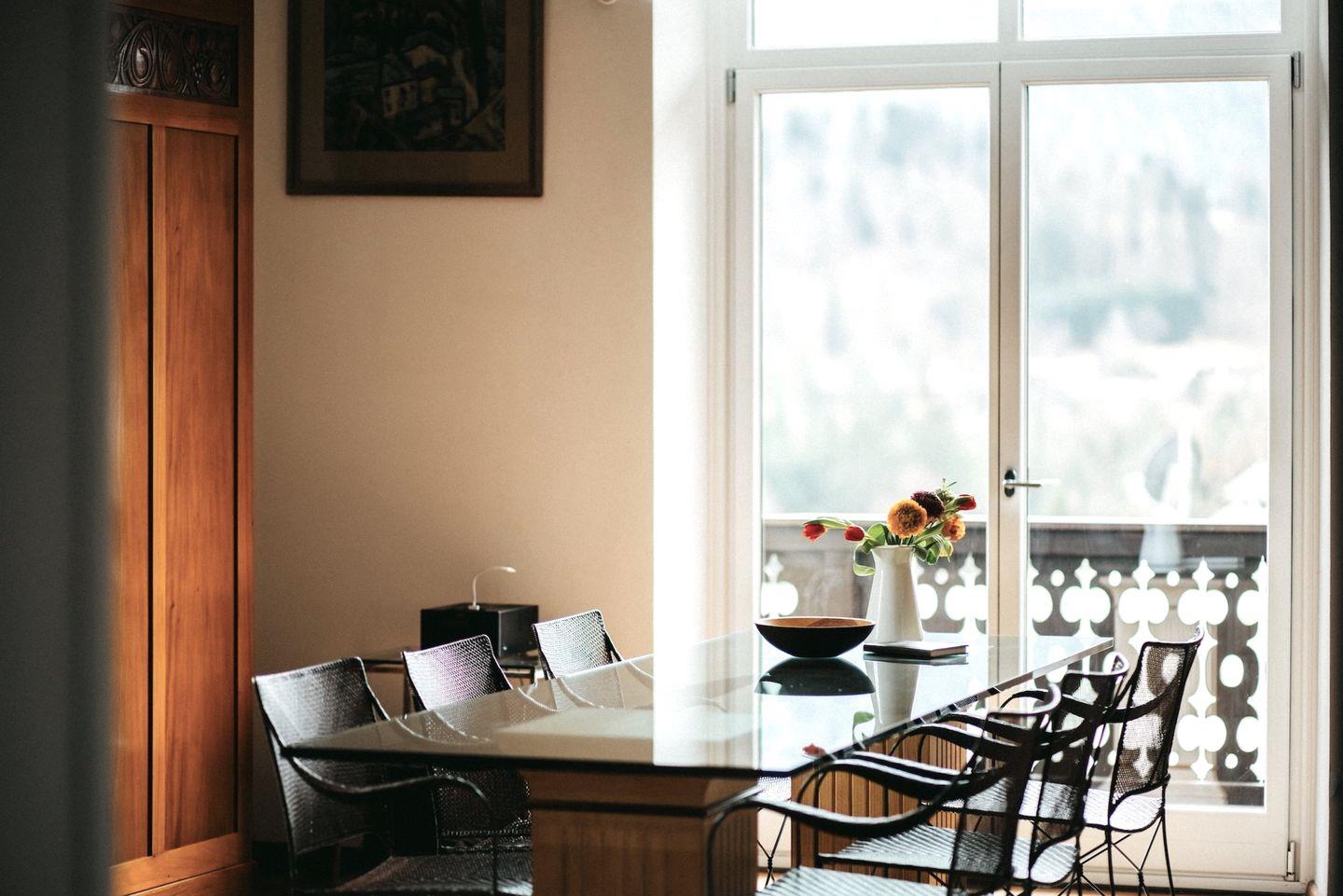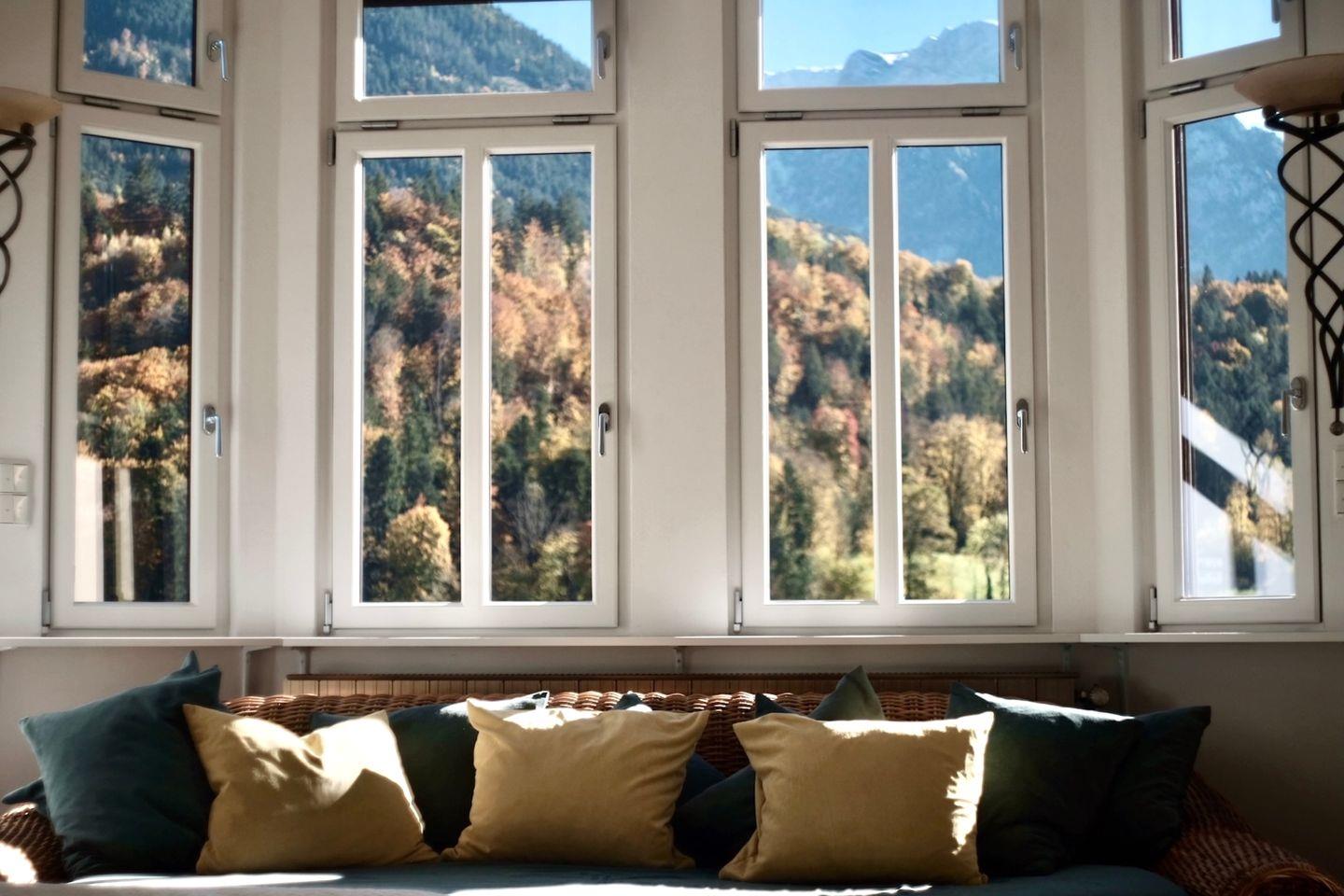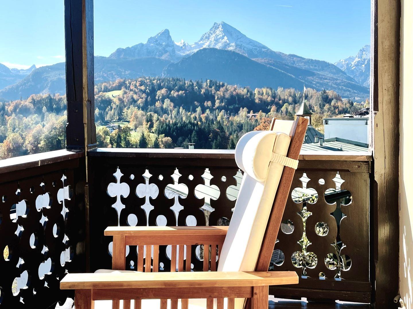 Ein Zimmer mit Aussicht, nur großzügiger: Der helle Wohnbereich öffnet sich mit übergroßen Fensterfronten zur Berchtesgadener Bergwelt, mit König Watzmann im Zentrum. Am großen Glastisch im Salon spiegelt sich das Panorama; wie von einem Logenplatz aus liegt es direkt vor Ihnen. Überdachte Veranda, Loggia, Balkon und Erker schaffen Lieblingsplätze mit Ausblick von Sonnenaufgang bis Sonnenuntergang.