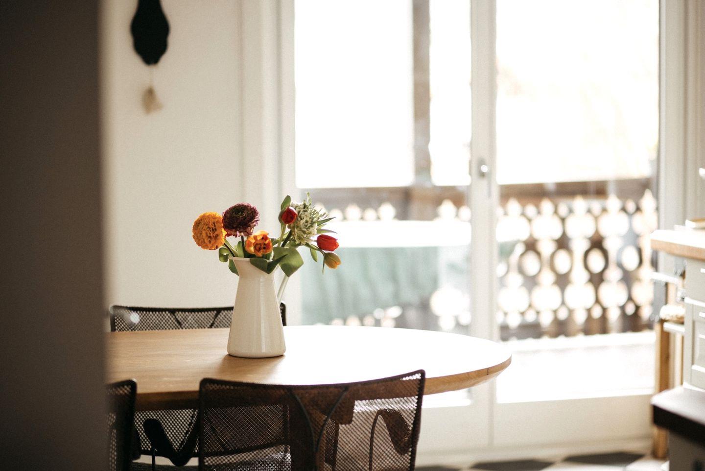 Viel Licht, hohe Räume und das Zusammenspiel aus Glas, Stuck, Eisen, Holz und Kunst verleihen der Wohnung ihren Charakter. Epochenmöbel, ein originaler Bronzelüster und das Klavier setzen Akzente.