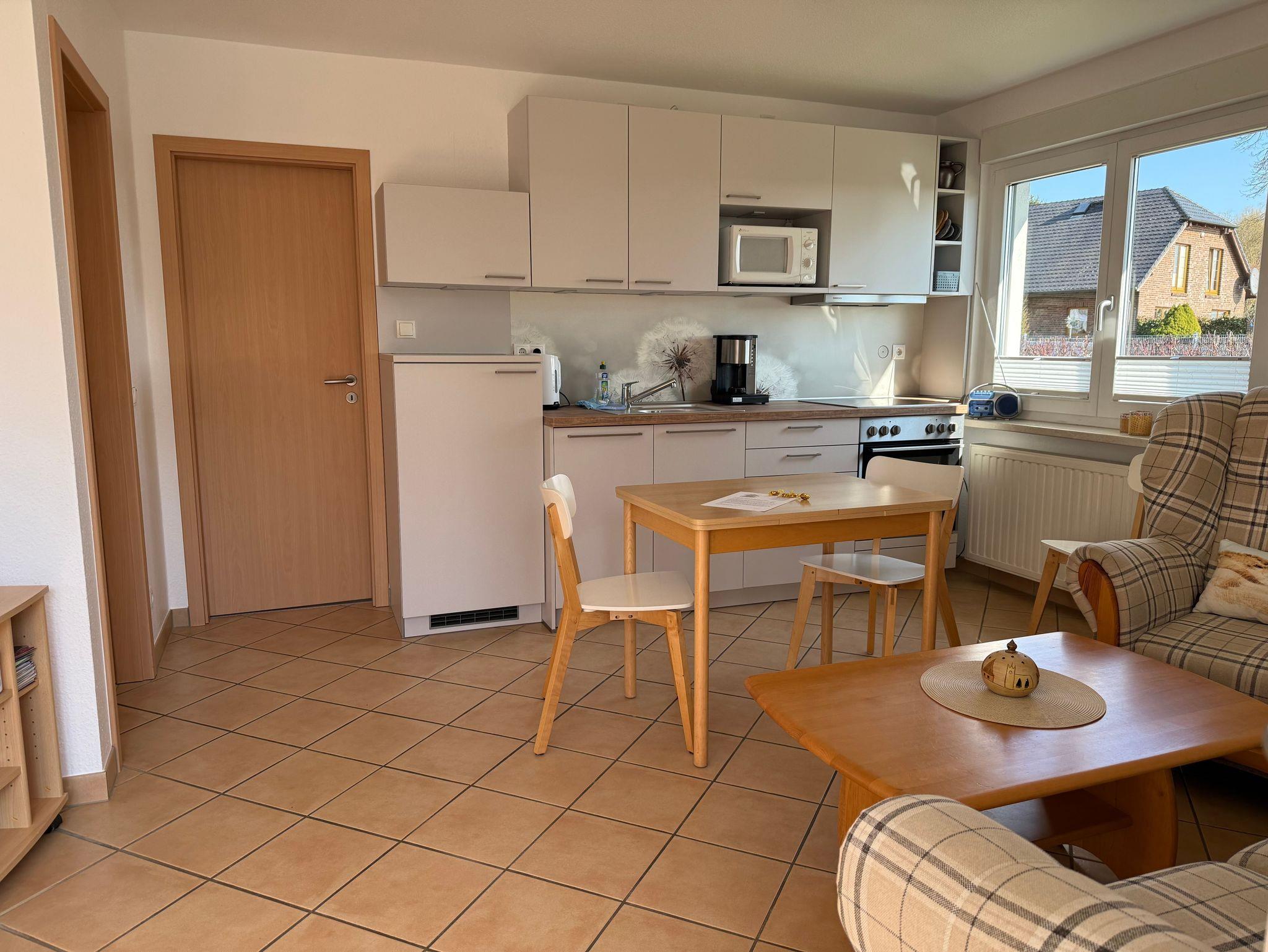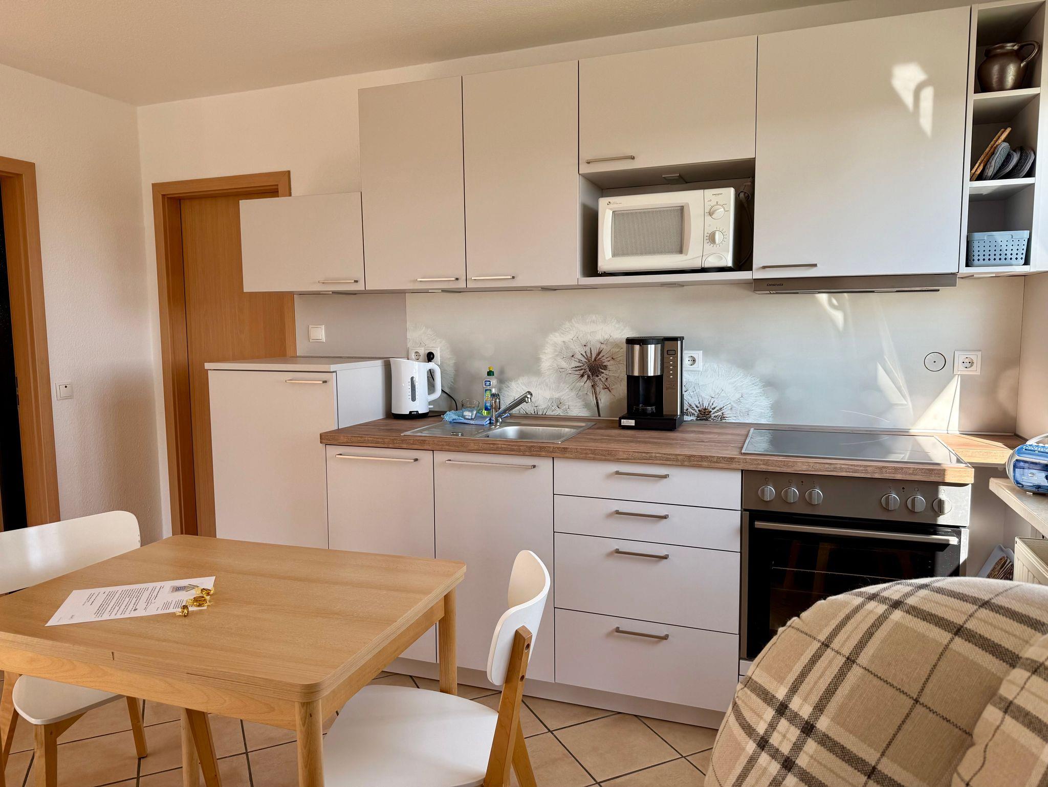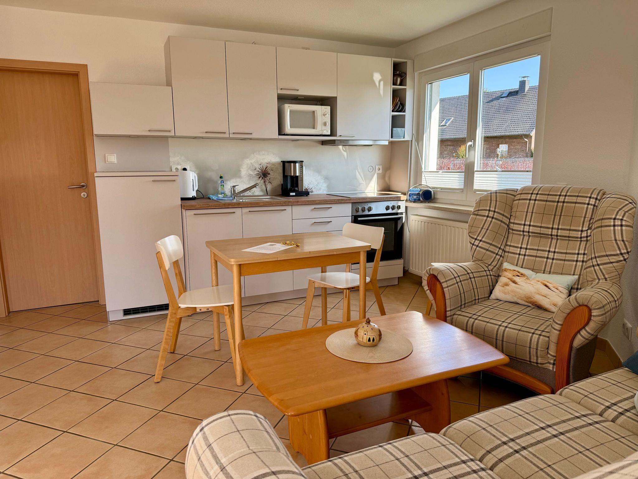 o einen Wohnbereich mit heller Wohnküche und Esstisch für 4 Personen, Ofen, Kochfeld, Kühlschrank mit Gefrierfach, Mikrowelle, Kaffeemaschine, Wasserkocher, Toaster, SAT-TV