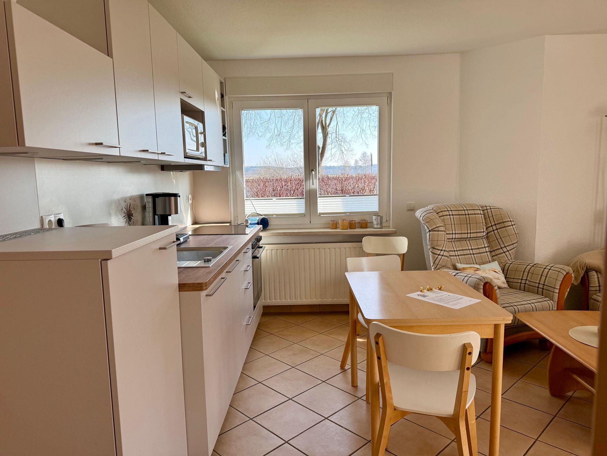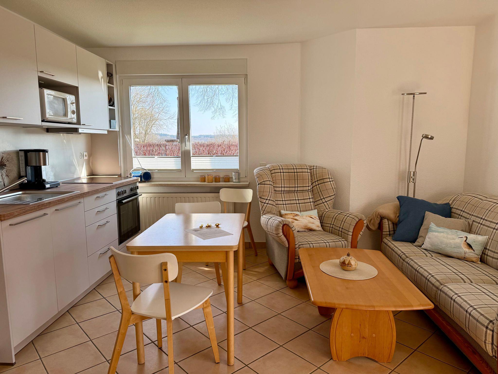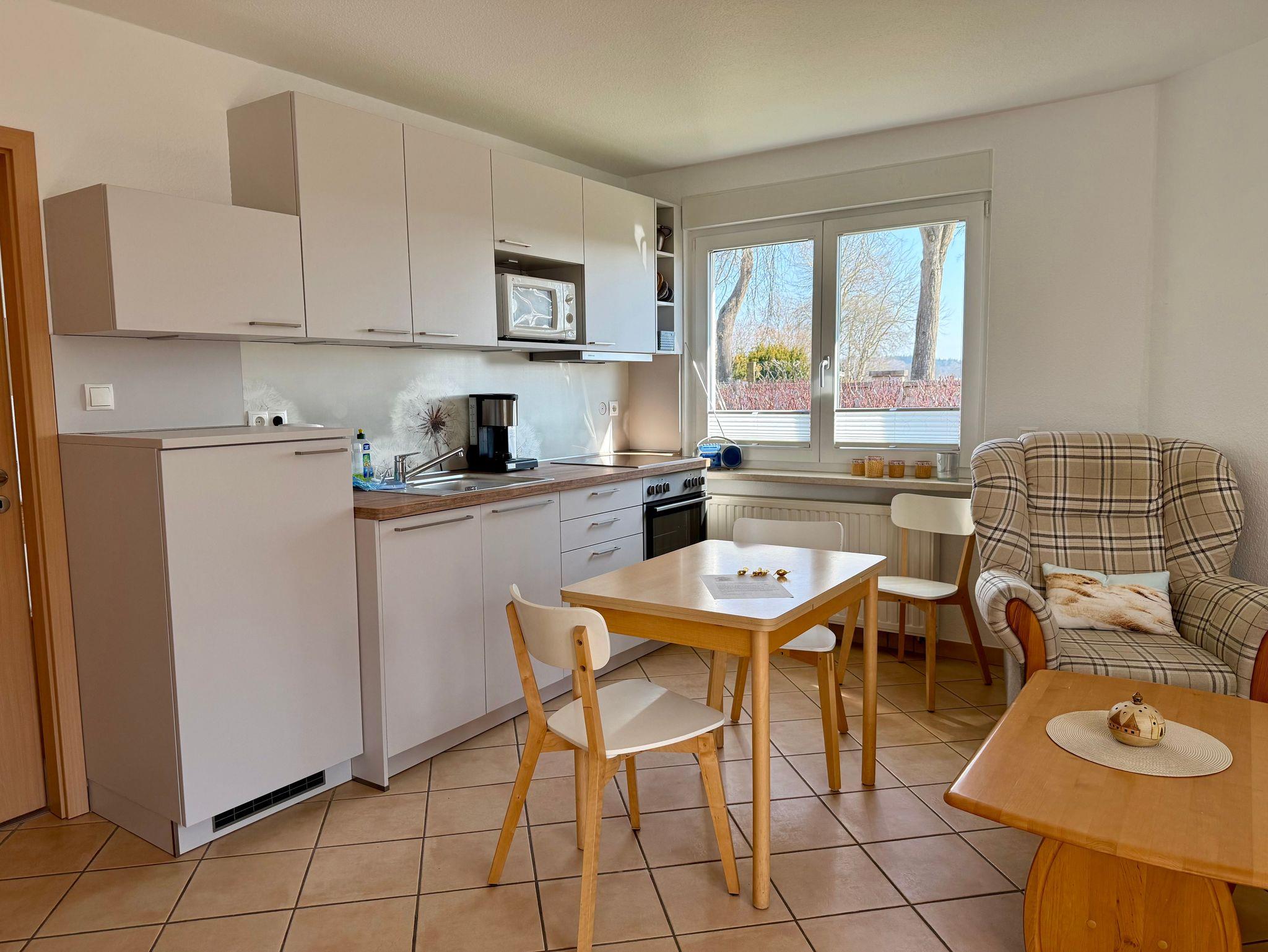 o einen Wohnbereich mit heller Wohnküche und Esstisch für 4 Personen, Ofen, Kochfeld, Kühlschrank mit Gefrierfach, Mikrowelle, Kaffeemaschine, Wasserkocher, Toaster, SAT-TV