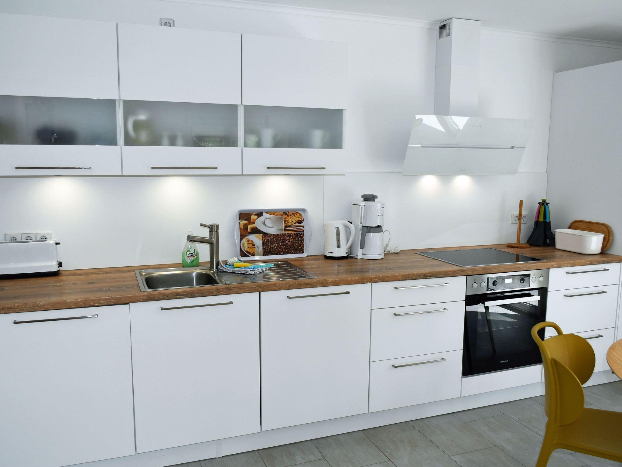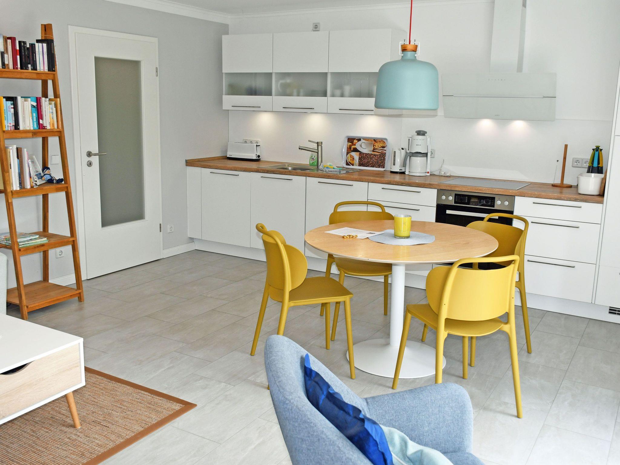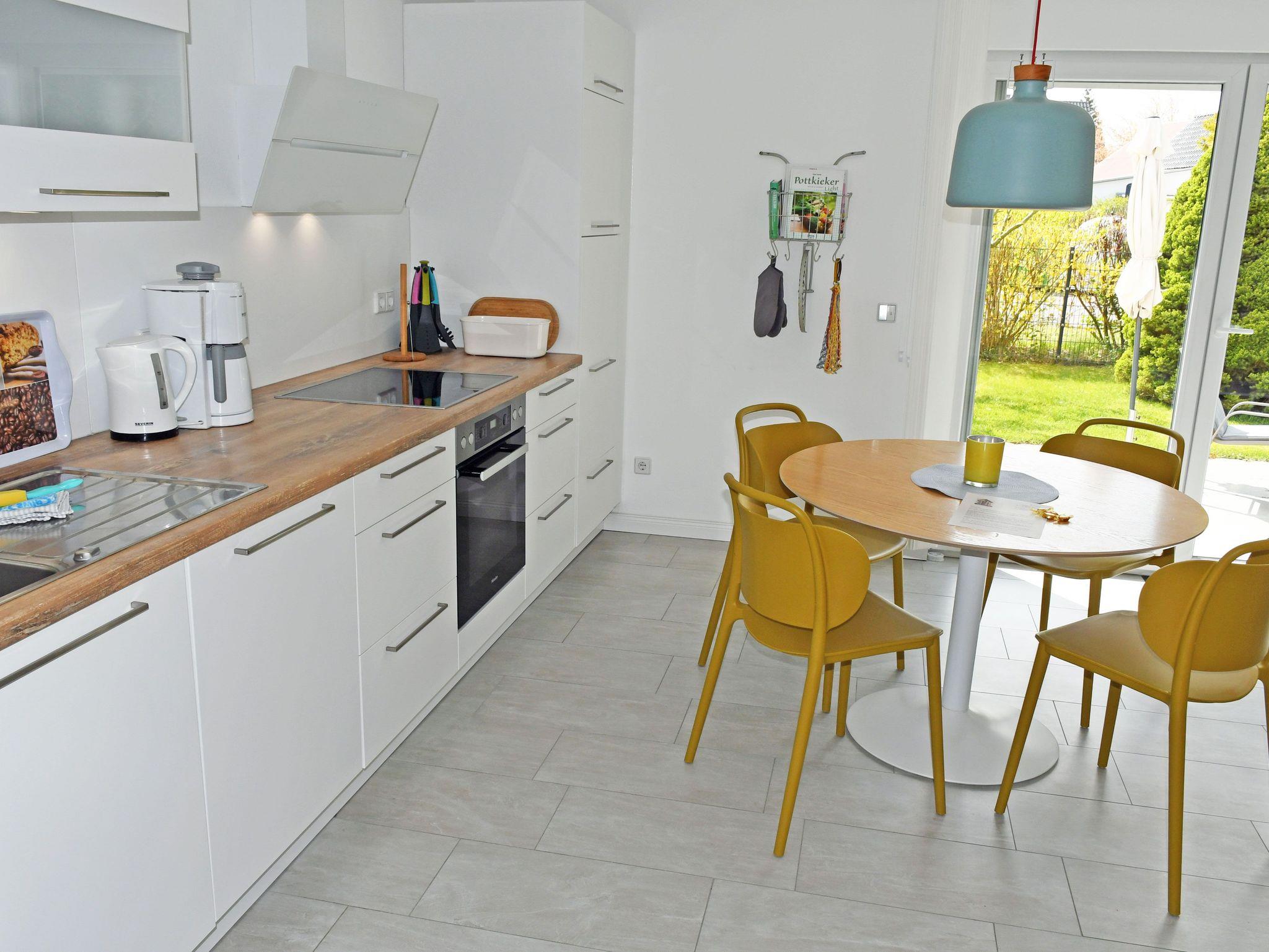 o einen Wohnbereich mit lichtdurchfluteter Wohnküche und großem runden Esstisch und Stühlen, Geschirrspüler, Ofen, Cerankochfeld, Kühlschrank mit Gefrierfach, Mikrowelle, Kaffeemaschine, Wasserkocher, Toaster, SAT-TV, Musikanlage mit CD und Bluetooth