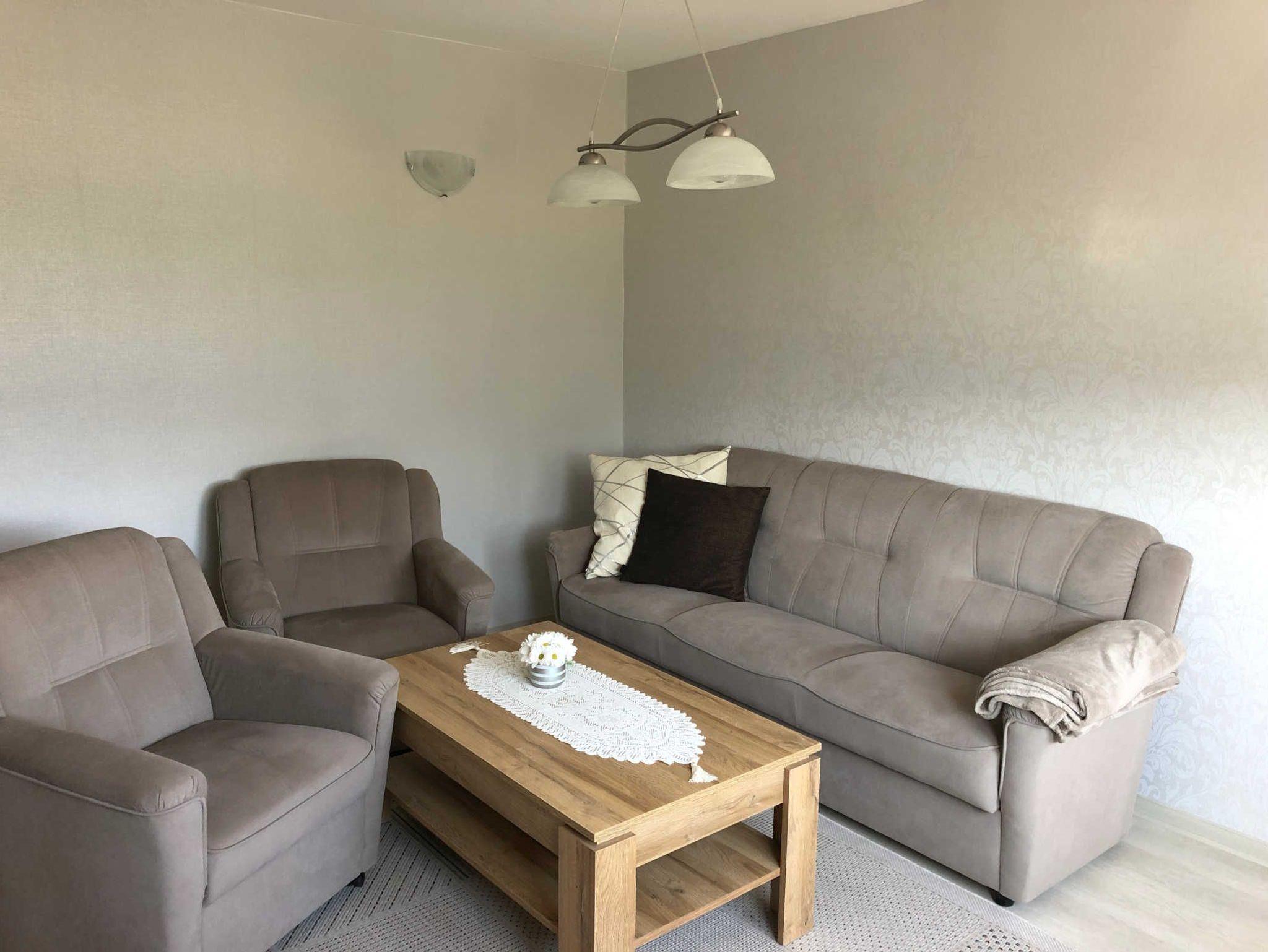 • ein Wohnzimmer mit Sofalandschaft und Flachbild-TV
