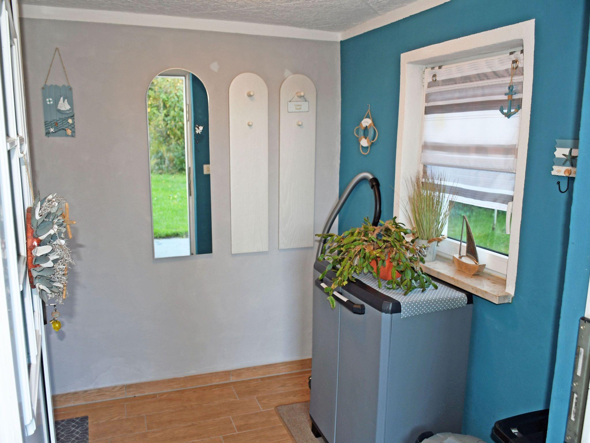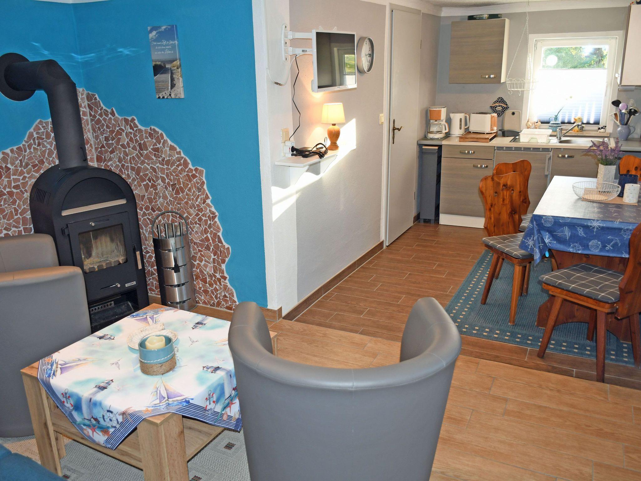 Das Ferienhaus befindet sich separat auf unserem weitläufigen Grundstück. Es ist ca. 40 qm groß, bietet Platz für maximal 2 Erwachsene und 2 Kinder (bis 12 Jahre) und wurde modern und liebevoll eingerichtet. Das Haus ist sowohl mit Fliesen als auch mit Teppichboden ausgestattet. Im Wohnraum befinden sich eine bequeme Sitzcouch (kann als Schlafcouch aufgebettet werden) mit Tisch und ein Radio und ein TV-Gerät mit DVD-Player. Hier steht auch ein großer Esstisch mit Stühlen. Bei Bedarf kann der Kamin angeheizt werden, der für Wärme und Behaglichkeit am Abend sorgt. Die Kosten für das Kaminholz sind selbst zu tragen.