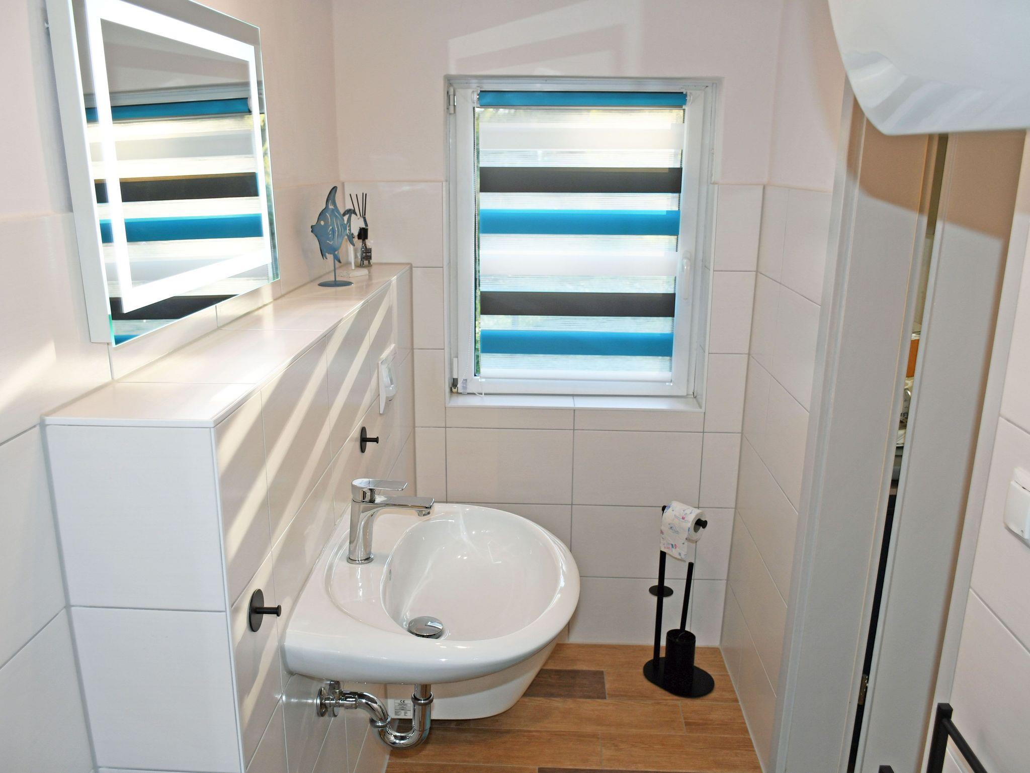 Das Bad ist mit Dusche, WC und Waschbecken ausgestattet und verfügt über Tageslicht.