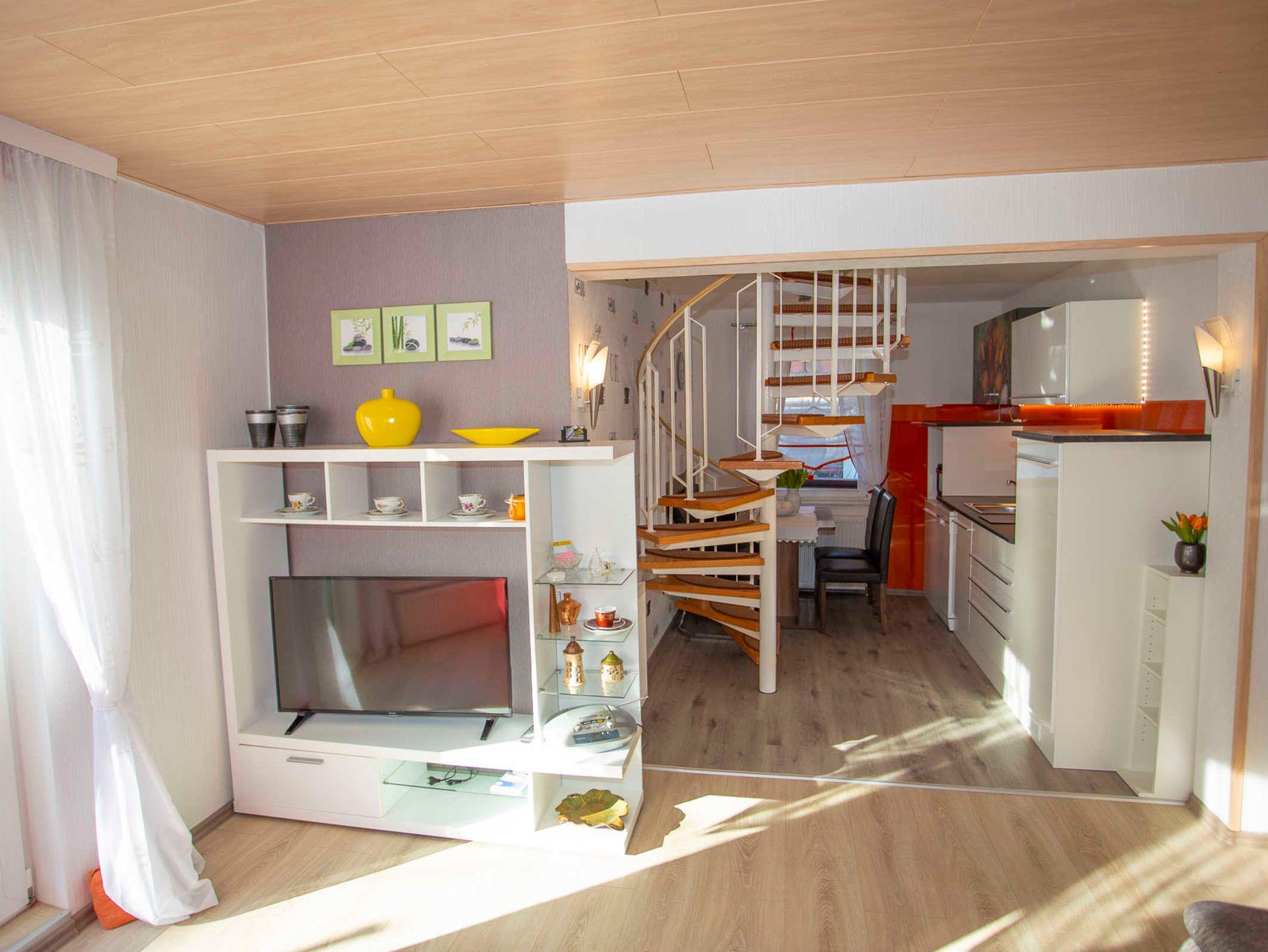 Im Erdgeschoss befindet sich neben dem Eingangsbereich das Wohnzimmer, ein kleineres Schlafzimmer (für 2 Personen), die offene Küche und ein Gäste-WC. Das Obergeschoss, welches über eine Wendeltreppe erreichbar ist, umfasst Bad mit Dusche, ein großes Schlafzimmer (2 Personen plus Aufbettung für 2 Personen) und eine Leseecke. Alle Räume sind hell, freundlich und modern eingerichtet. Die Küche ist ausgestattet mit mit 2-Platten-Ceranfeld und Minibackofen, Kühlschrank, Geschirrspüler, einem Frühstückscenter und allem notwendigen Geschirr.