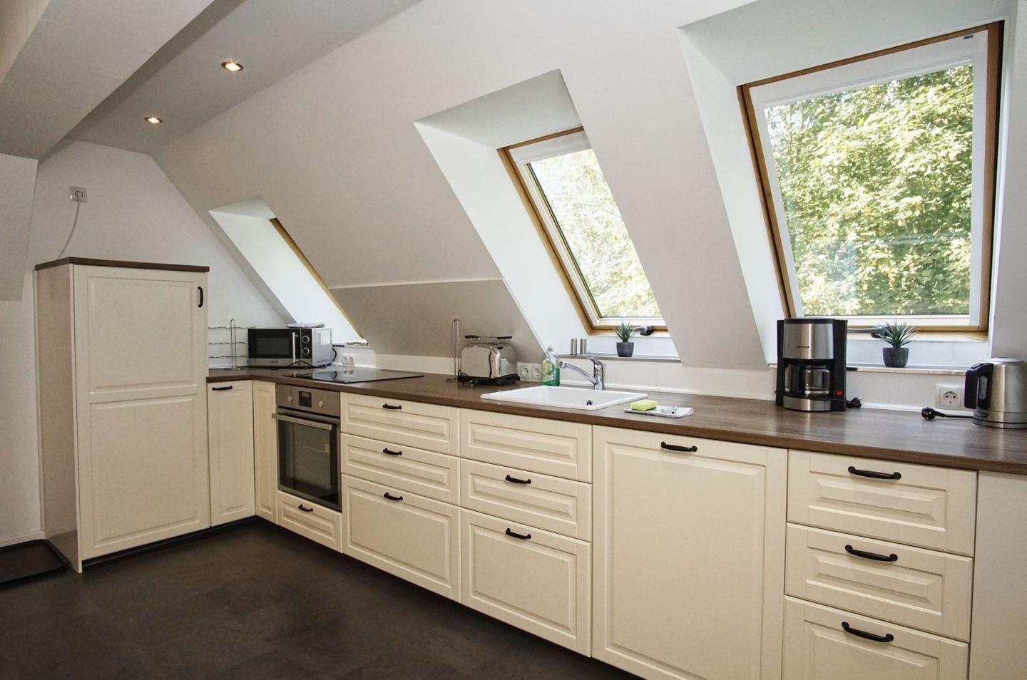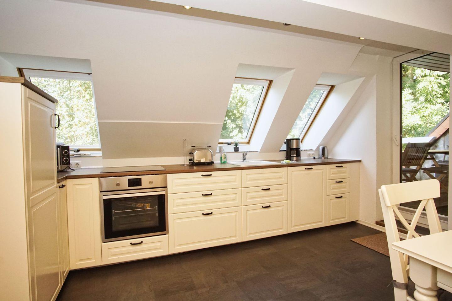 KÜCHE // geschlossene Küche, 4-Felder Cerankochfeld, Backofen, Kühlschrank mit Gefrierfach, Mikrowelle, Toaster, Wasserkocher, Kaffeemaschine, reichlich Besteck, Geschirr, Küchenutensilien und Essbereich ++