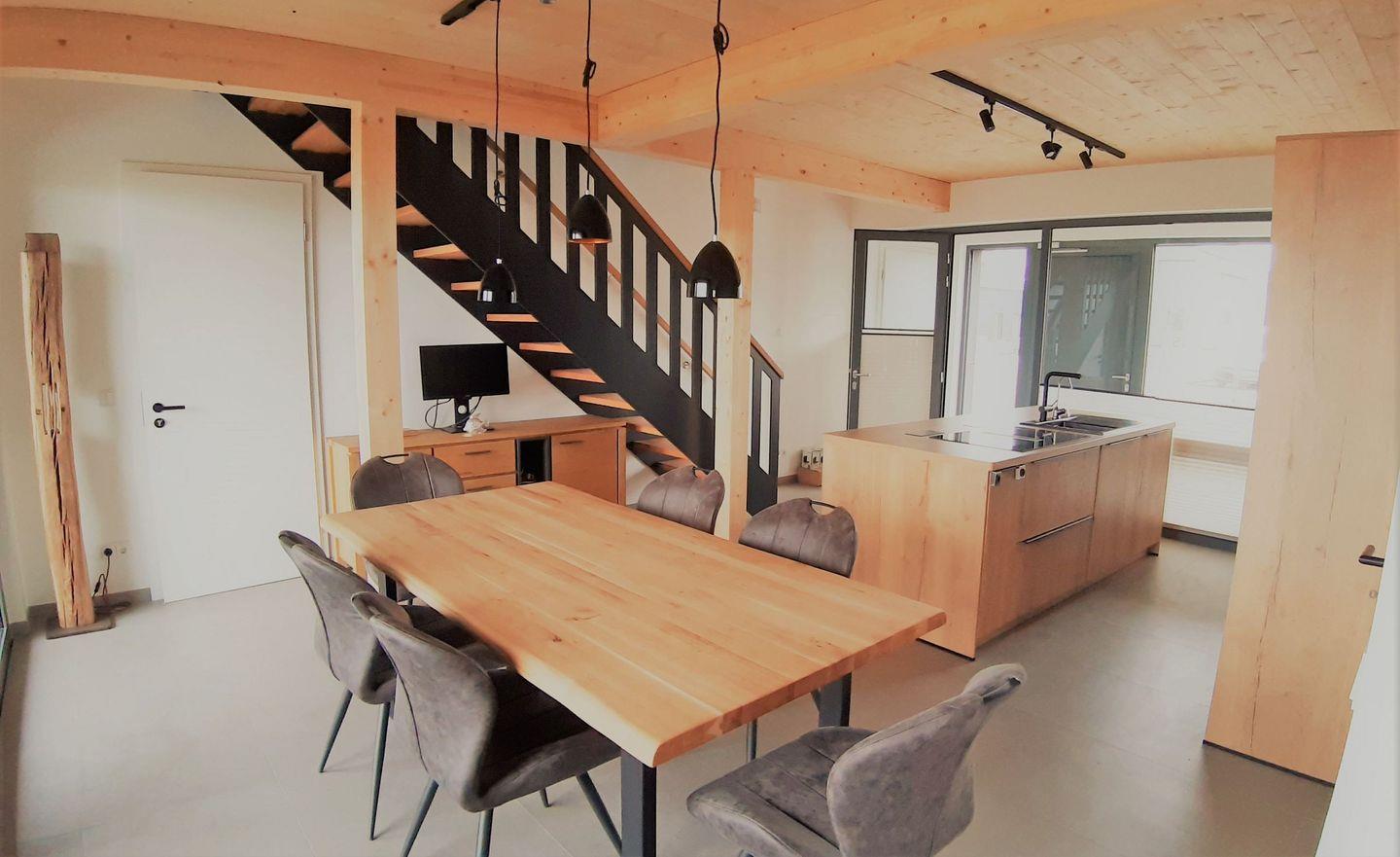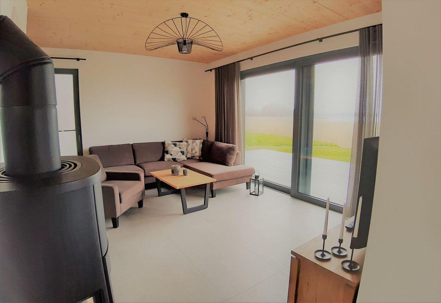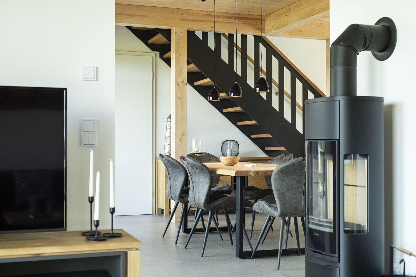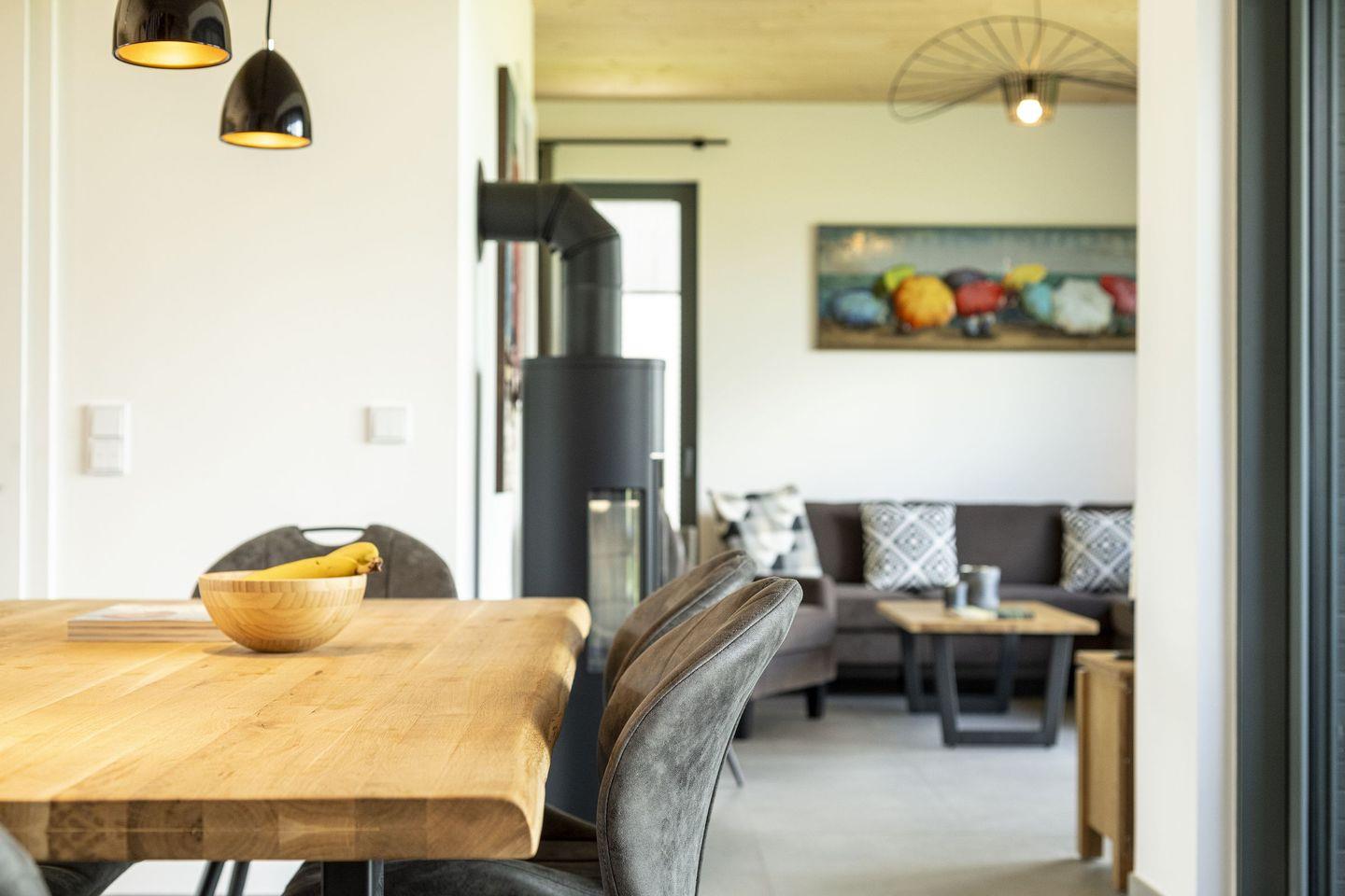 Das Herzstück des Hauses ist der großzügige Wohnbereich mit moderner, offener Küche inklusive Kochinsel, großem Essplatz, Kaminofen sowie einer gemütlichen Couchecke mit TV und Blick ins Grüne.