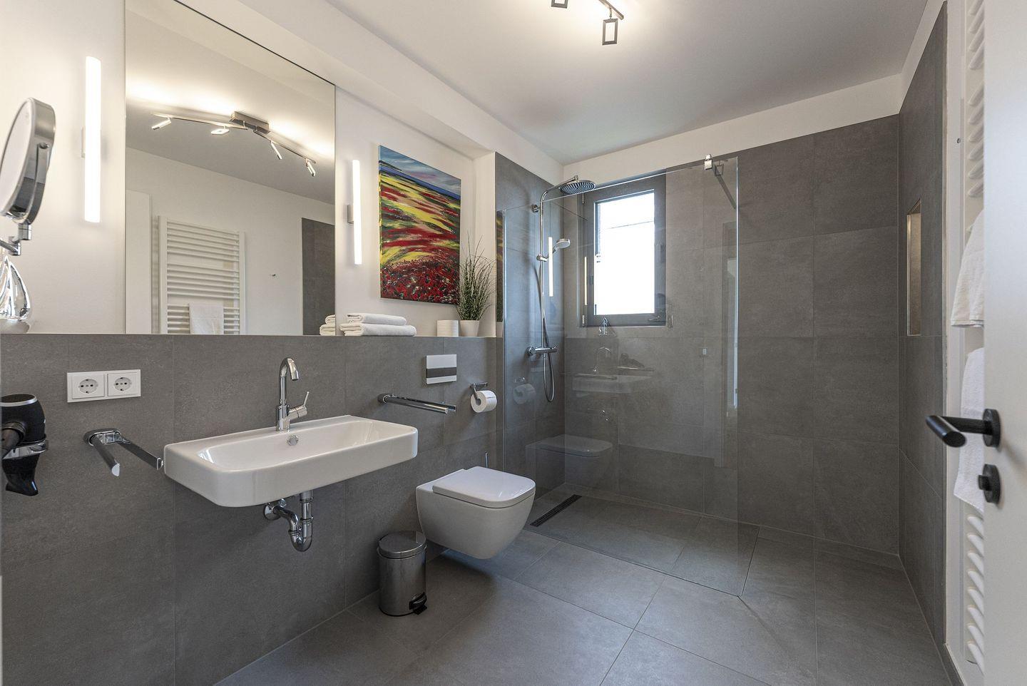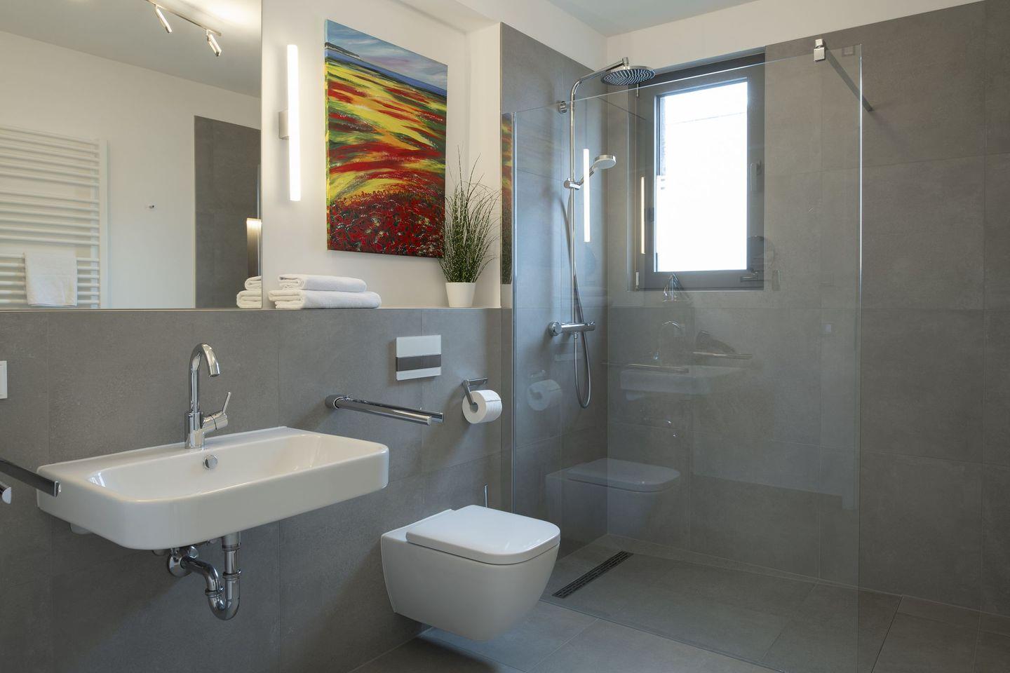 Im Obergeschoss erwarten Sie zwei weitere großzügige Schlafzimmer, jeweils mit Doppelbett und TV, sowie ein Badezimmer mit Walk-in-Dusche und Fenster.