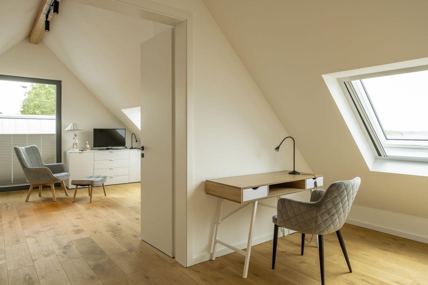 Im Spitzboden befinden sich zwei Einzelbetten sowie ein Arbeitsbereich mit Schreibtisch und traumhaftem Blick auf den Bodden. Selbstverständlich steht Ihnen kostenfreies WLAN mit Glasfaseranschluss zur Verfügung.