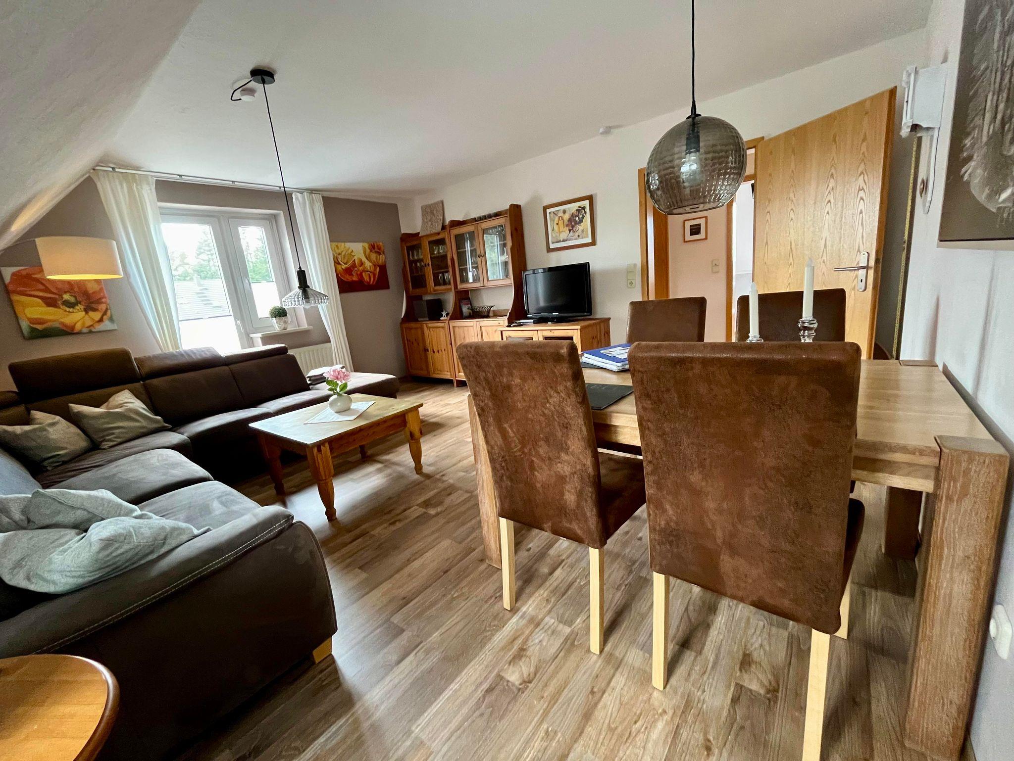 Vollausgestattete Ferienwohnung im Obergeschoss. Im großen Schlafzimmer ist ein Doppelbett 1,80 x 2,00m sowie ein Flachbildfernseher vorhanden. In dem zweiten (kleinen) Schlafraum steht den Gästen ein Einzelbett 0,90 x 2,00m zur Verfügung. Die Küche ist mit einem Induktionsherd, Kühlschrank, Kaffeemaschine, Mikrowelle, Wasserkocher und einem Geschirrspüler ausgestattet. Im Wohnzimmer befindet sich ein Flachbildfernseher und ein Esstisch. Vom Wohnzimmer aus können Sie auf den Balkon gehen.