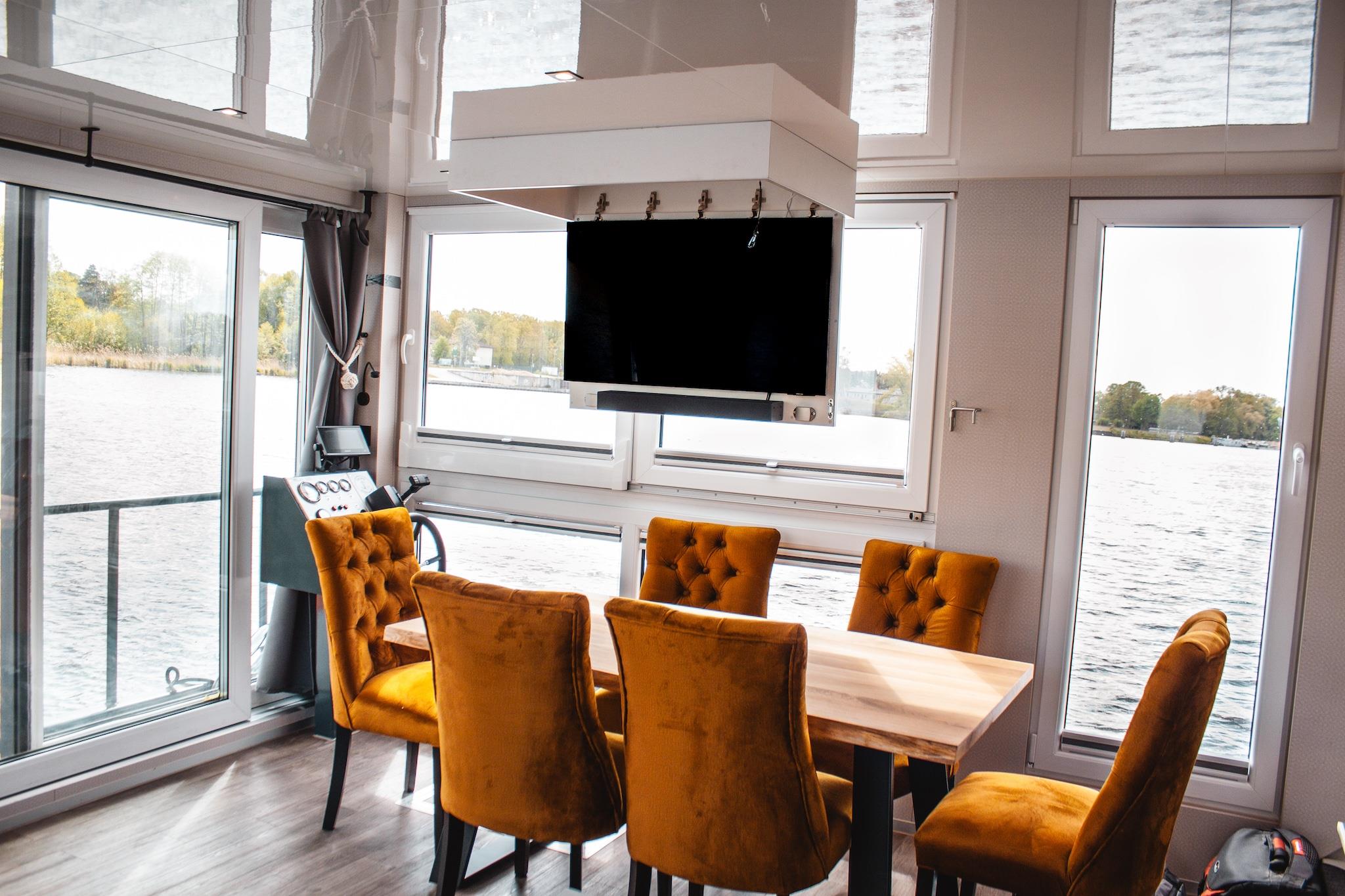 Opplev ren avslapning i vårt moderne flytende feriehus, trygt forankret i vannet. Med tre koselige soverom, et stilig bad, et ekstra gjestetoalett og en innbydende stue og spisestue, tilbyr det perfekt komfort for opptil seks personer. Den private badstuen med utsikt over vannet gir ditt eget personlige velværeøyeblikk, mens de store vinduene oversvømmer rommet med lys og skaper en følelse av frihet. Nyt solfylte timer på takterrassen, start dagen på en avslappet måte, eller avslutt kvelden med et glass vin rett over vannet. Området rundt byr på en rekke fritidsaktiviteter: Oppdag de idylliske elvestiene i Dahme for lange turer eller sykkelturer, lei et SUP-brett eller kano for en tur på vannet, utforsk de nærliggende skogene i Müggelberg, eller besøk innsjøen Müggelsee med sine strender og vannsportfasiliteter. Stedet har også mye å tilby når det gjelder mat og kultur – små kafeer, restauranter ved vannkanten og de sjarmerende distriktene Köpenick og Grünau er alle innen rekkevidde. Denne husbåten er det perfekte tilfluktsstedet for alle som ønsker å kombinere fred, natur og stilig bokomfort på en unik beliggenhet.