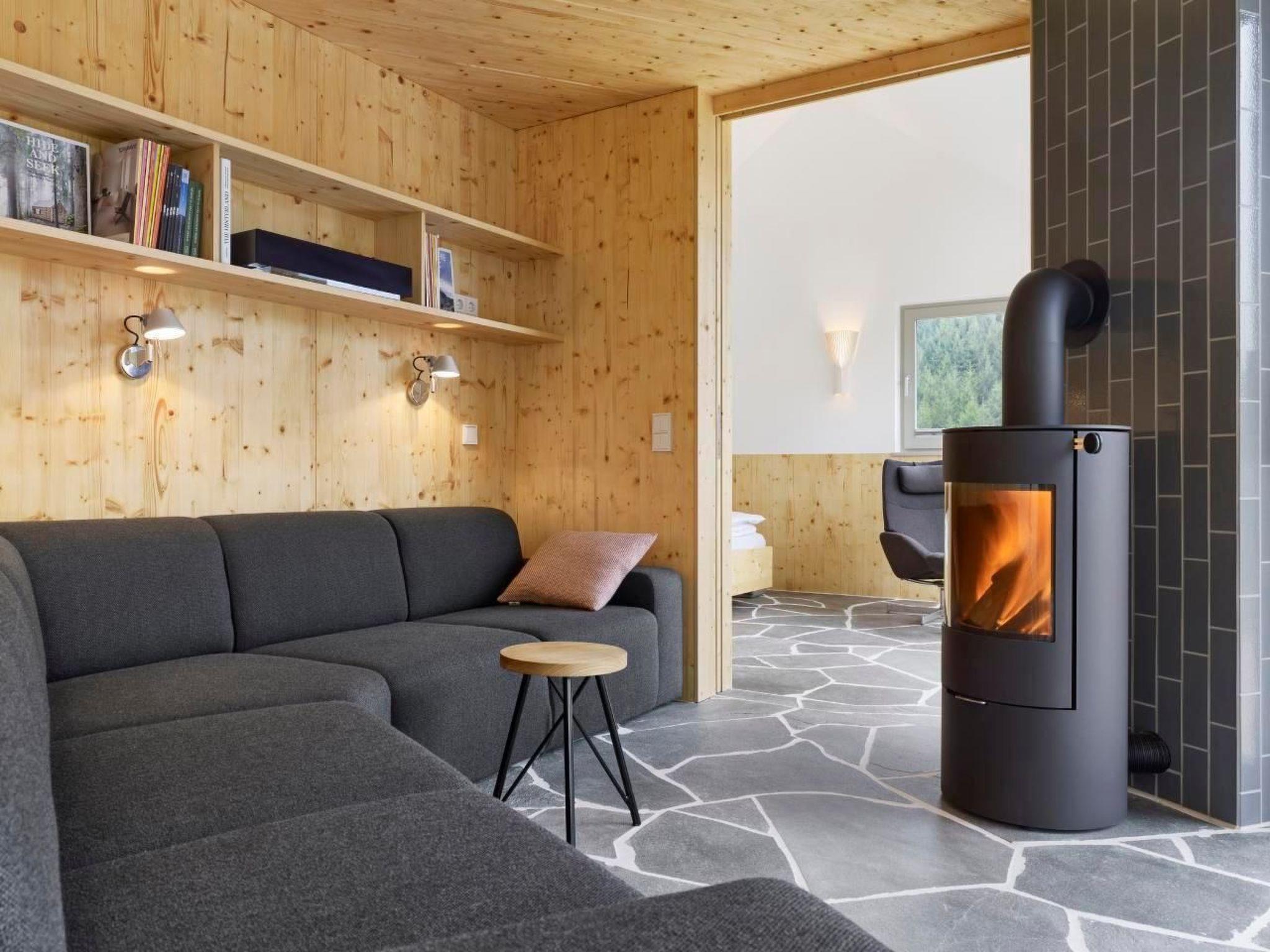 The wooden house on top is clad with raw wooden planks in inverted panelling. This wood is carbonised, i.e. the surface has been flamed until the top layer forms black charcoal - a rough and archaic treatment that stops the weathering process of the wood. As in a charcoal burner's hut, the chimney of the central fireplace forms the vertical end of the gable - it too is clad in black wood.