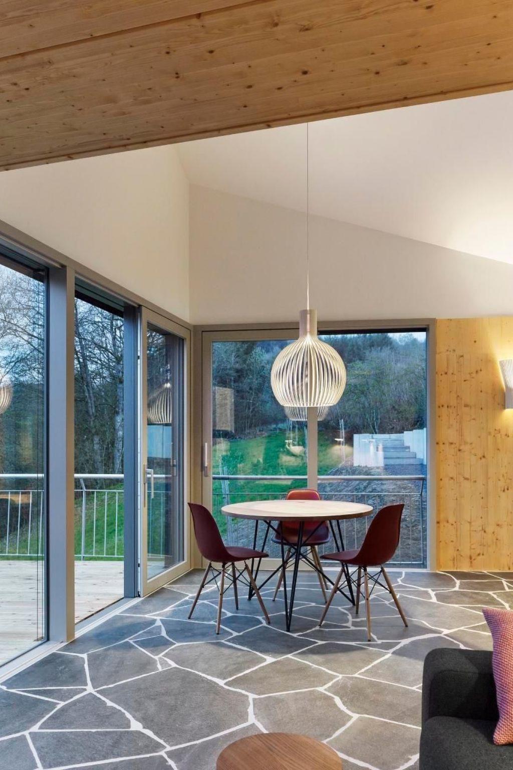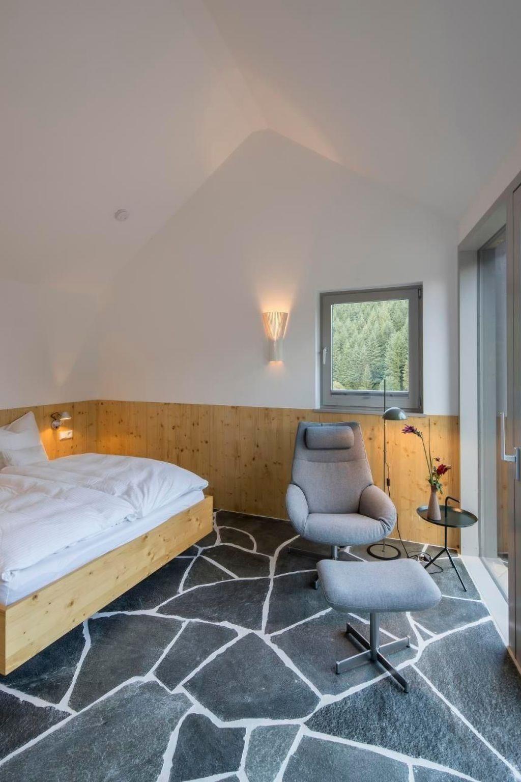 Inside, the archaic materialisation continues in a refined form: a continuous floor covering with polygonal slabs of split greenish shimmering quartzite runs through the continuum of all room areas. The white interior walls in the upper area are intimised at user level by warm wood panelling. A few select colour and material accents complete the picture.