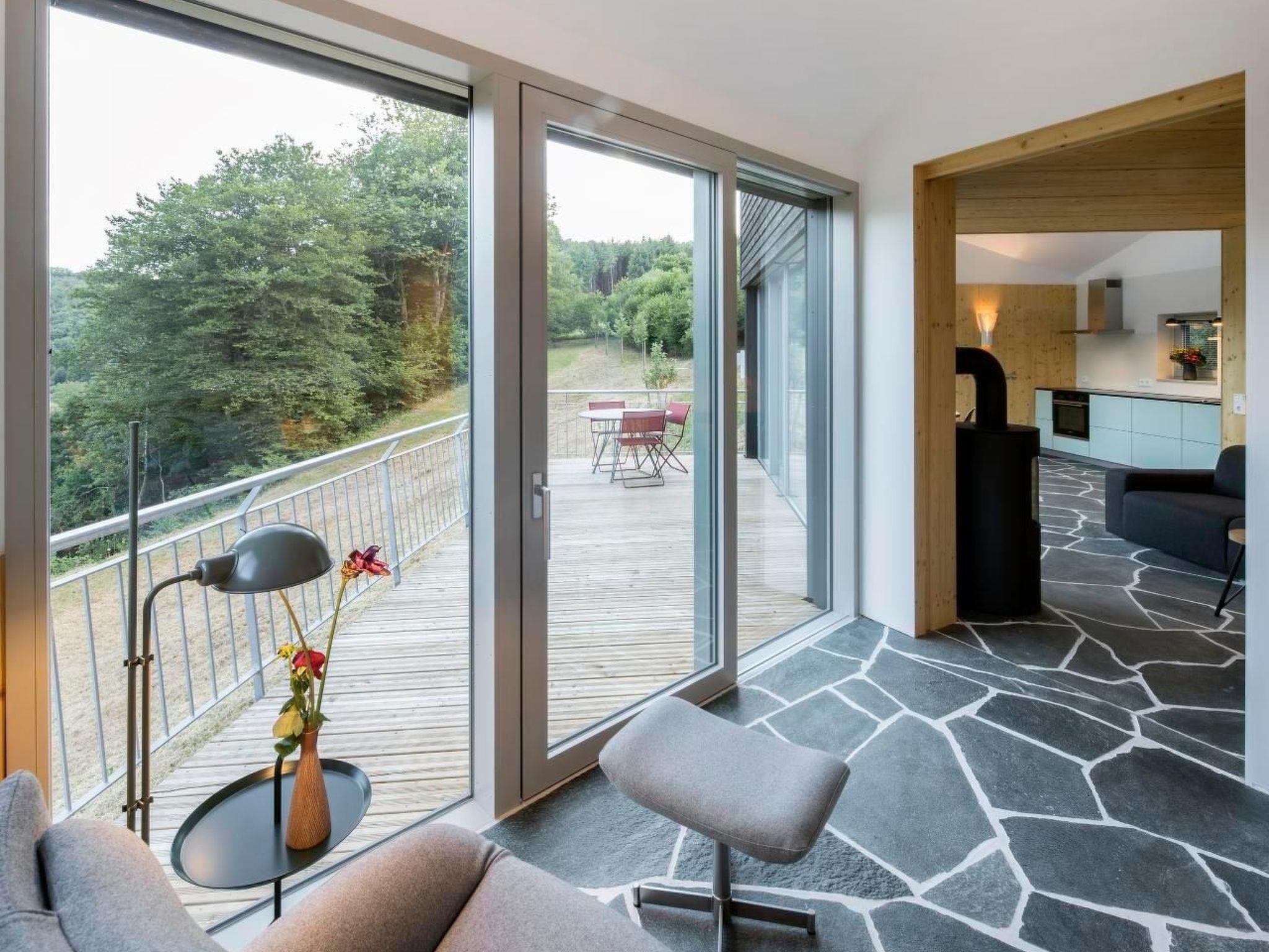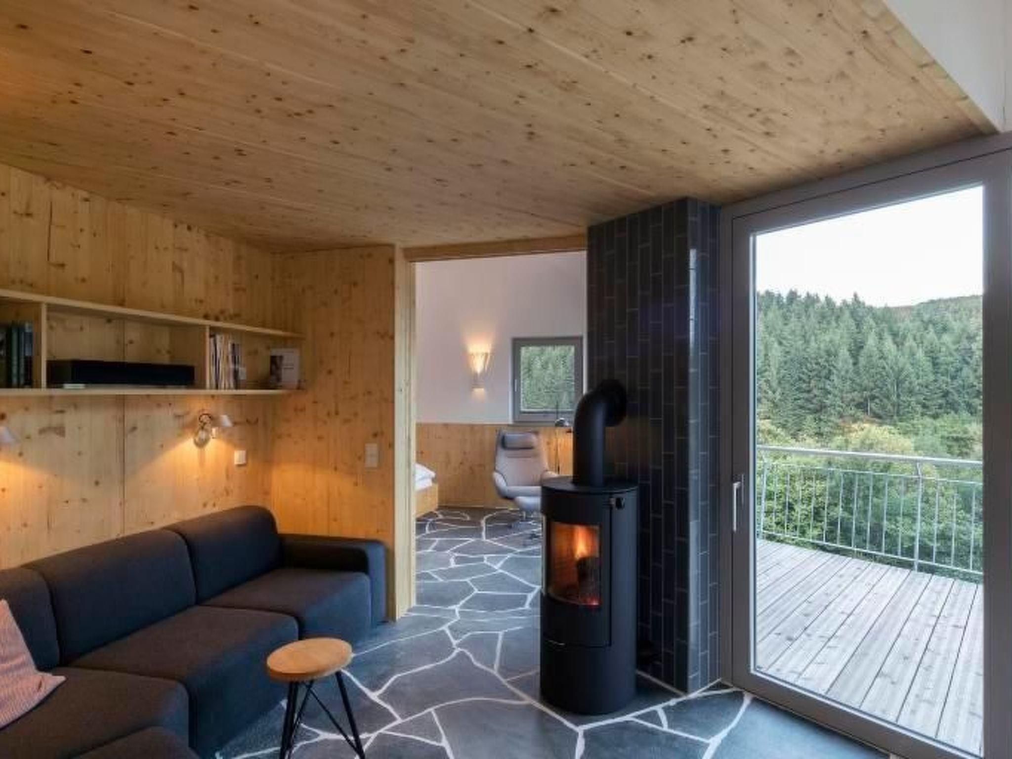 An entrance on the hillside opens up to the living and dining room with kitchenette. This high-ceilinged room opens up to the rising roof and exudes generosity. The rising roof and the large ribbon window give the living space a strong focus on the view of the valley. The living area with its high ceilings leads into the "fireplace room". This area occupies the inner corner of the house and is the most intimate part of the room sequence. With its greatly reduced ceiling height and the closed two-sided rear wall, the room offers a sheltered corner from whose built-in sofas both the open fire in the inner corner and the view of the valley can be viewed.