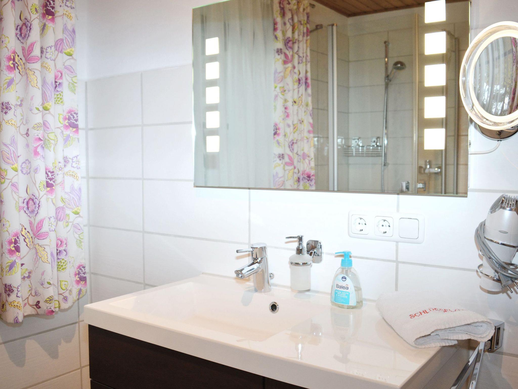 Ein großes und modernes Bad, ausgestattet mit Dusche, WC, Bidet, Waschbecken, Haartrockner bietet viel Platz für die Privatsphäre.