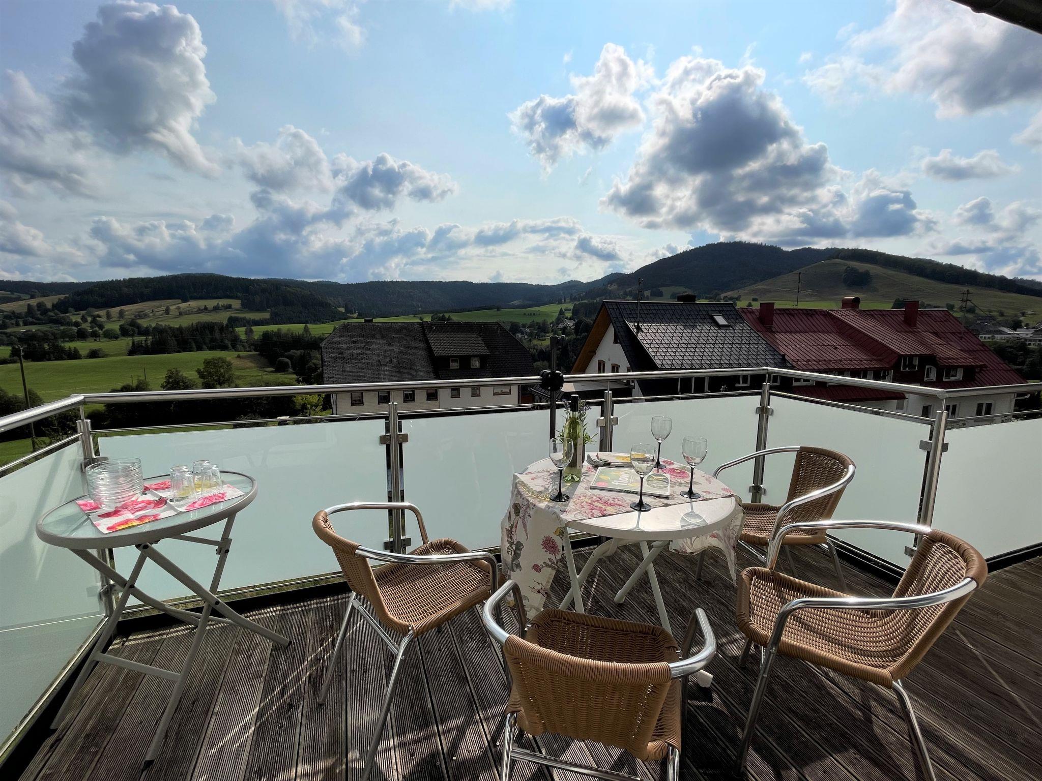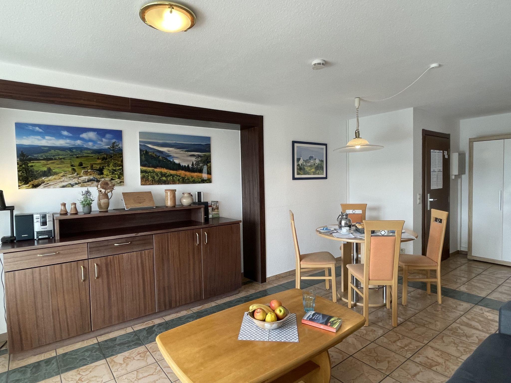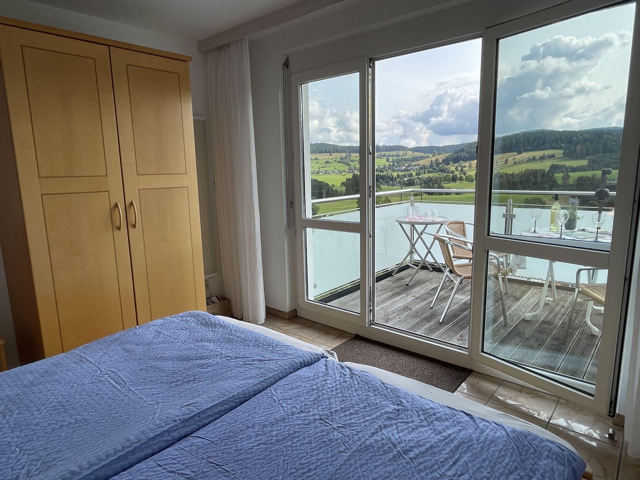 "Schwarzwaldblick I", 3-room apartment 74 m2, on the ground floor. Practical furnishings: living/dining room with 1 double sofabed, dining table and satellite TV. Exit to the balcony. 1 room with 1 double bed. Exit to the balcony. 1 double bedroom. Kitchen (4 hot plates, dishwasher, kettle, microwave, electric coffee machine). Shower/WC. Heating. Balcony. Balcony furniture. Facilities: children's high chair, baby cot. Internet (WiFi, free). Garage (1 car). Please note: non-smokers only. Smoke alarm.