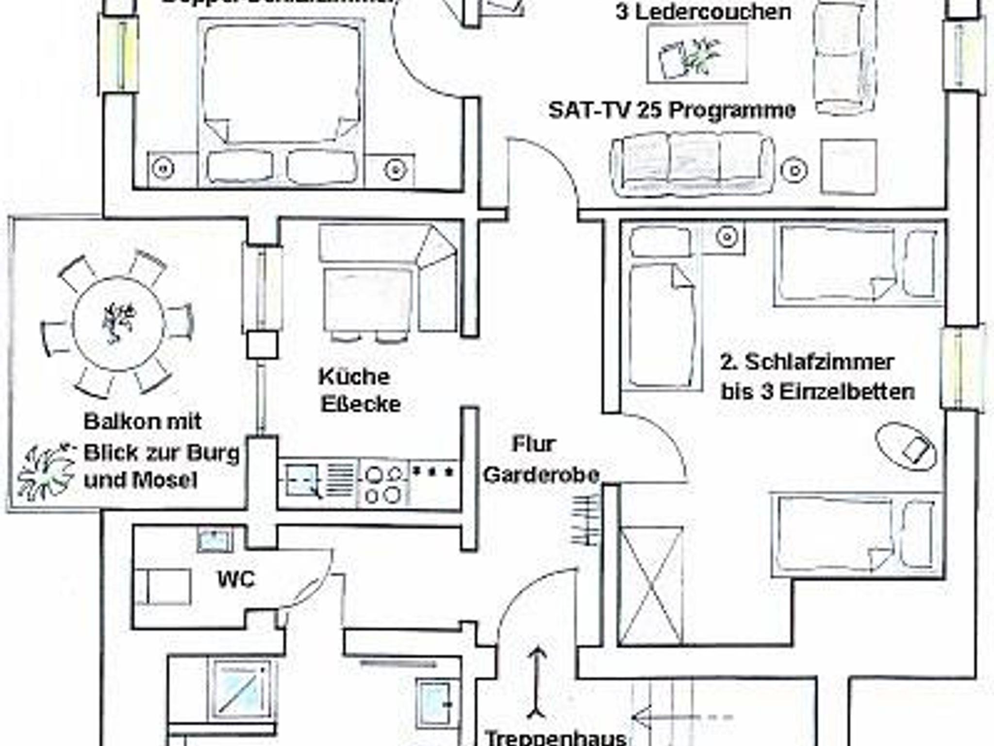 Ferienwohnungen für 2 bis 8 Personen in einer ruhigen Seitenstraße mit Blick zur Burg und/oder Mosel. Kurze Wege, innerhalb weniger Gehminuten erreichen Sie Bus, Bäcker, Edeka-Supermarkt, Weinstuben, Cafés, Restaurants und die Mosel-Fahrrad- und Wanderwege.