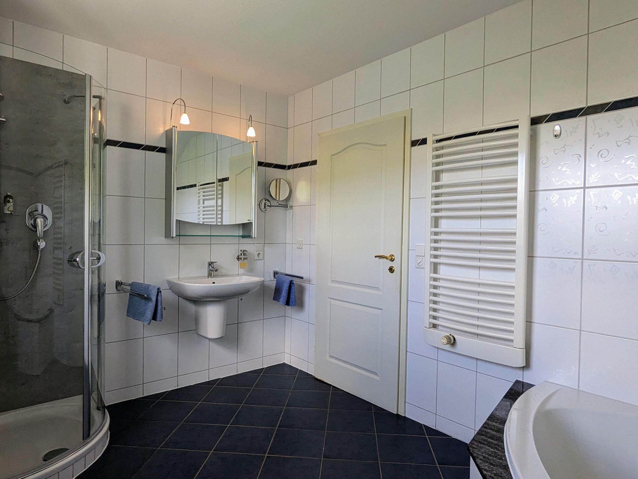 Das Bad verfügt über eine separate Dusche sowie eine große Badewanne.