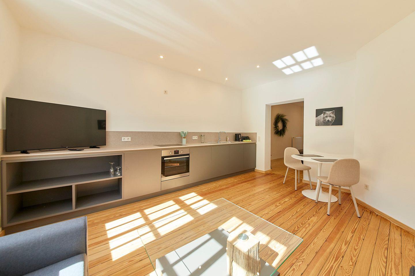 Wohnzimmer mit offener Küchenzeile und Essbereich