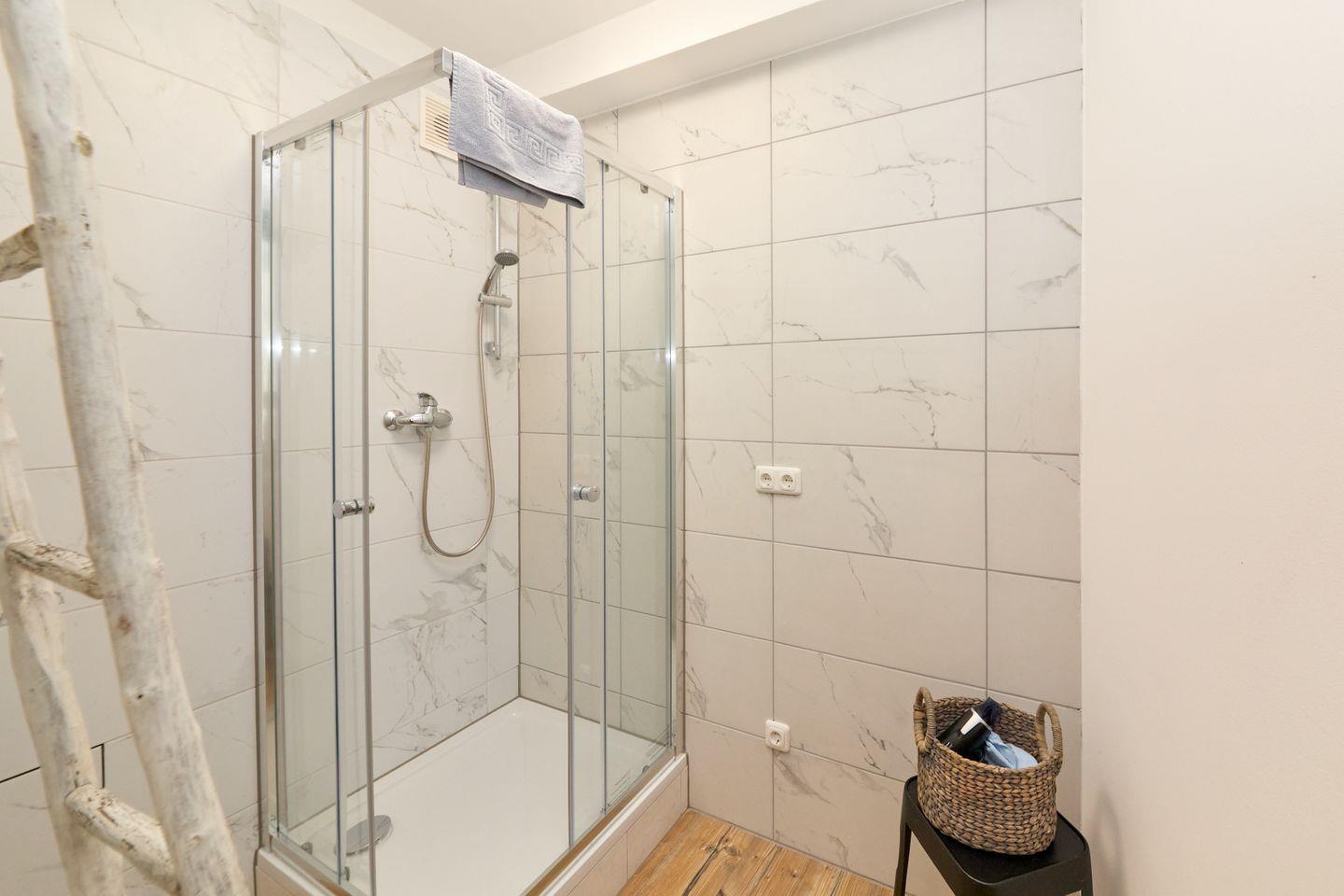 Das Badezimmer bietet mit einem Waschbecken und separaten WC, den notwendigen Komfort. Ein besonderes Highlight ist die Dusche, welche sich in einem offenen Raum hinter der Küche befindet Für Ihren Aufenthalt stehen Ihnen Hand-, Badetücher sowie Bettwäsche bereit.