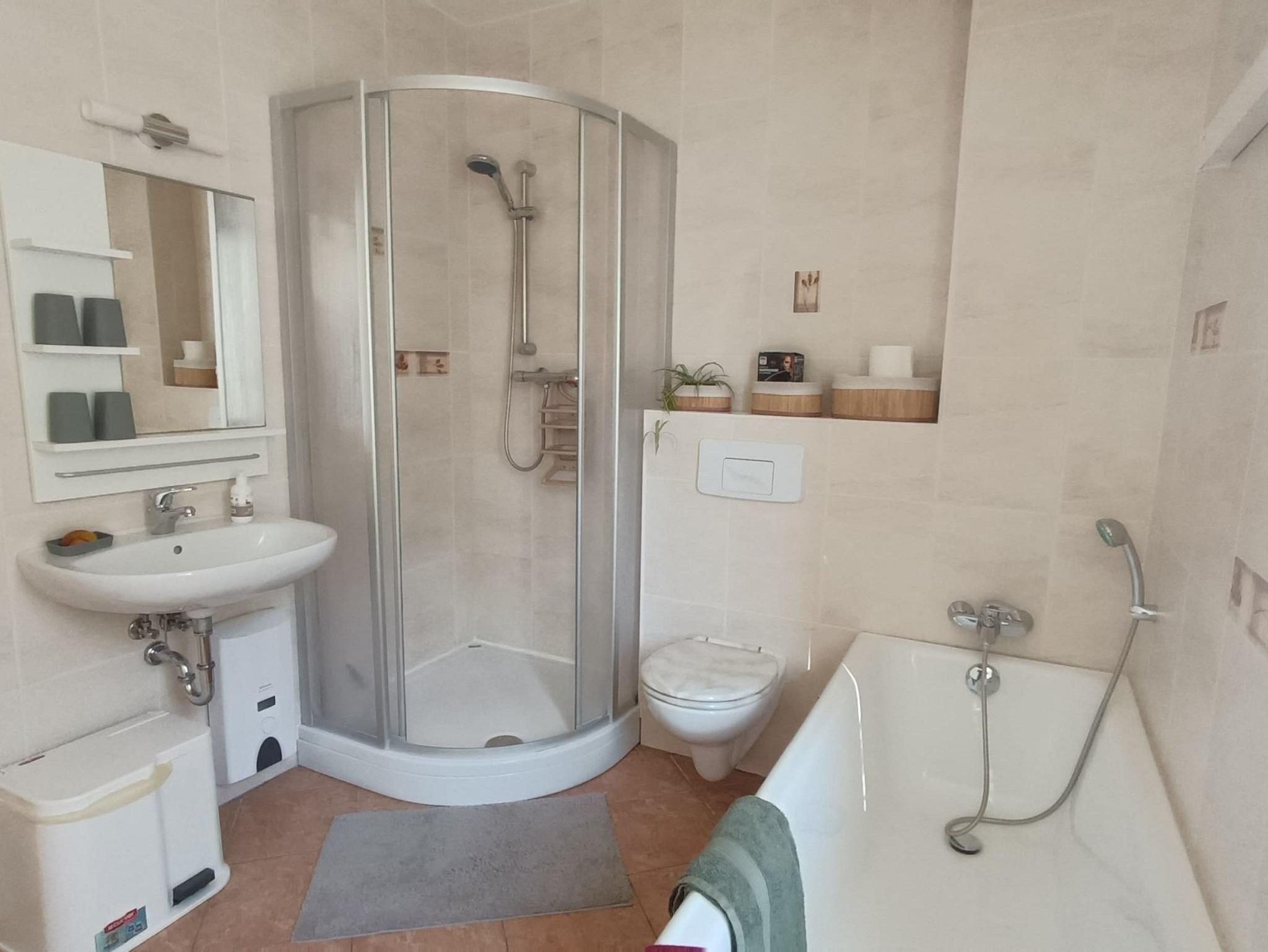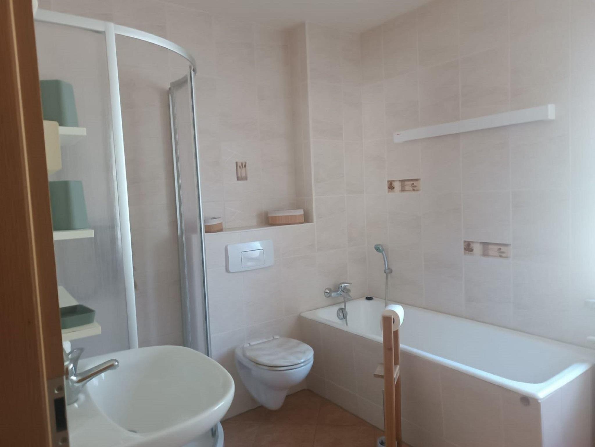 Im Bad gibt es neben Dusche und WC eine Badewanne.
