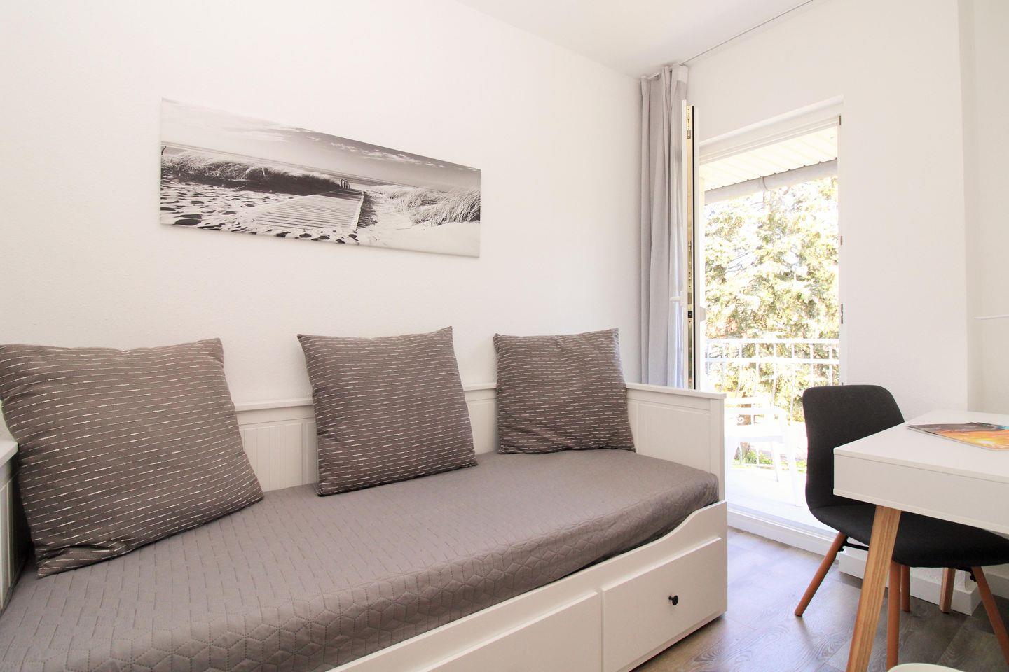 Das freundliche, separate und zusätzliche 2. Schlafzimmer verfügt über ein bequemes Einzelbett sowie einen kleinen Schreibtisch mit Stuhl. Dieses Zimmer verfügt ebenfalls über einen eigenen kleinen Balkon.