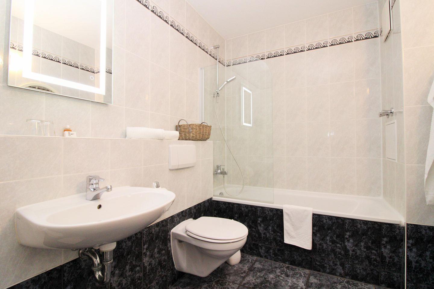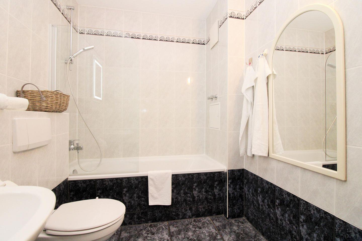 Das geräumige Badezimmer verfügt über eine Badewanne mit Echtglas-Duschabtrennung, Waschbecken und WC, Föhn, Kosmetikspiegel sowie ausreichend Ablagemöglichkeiten.