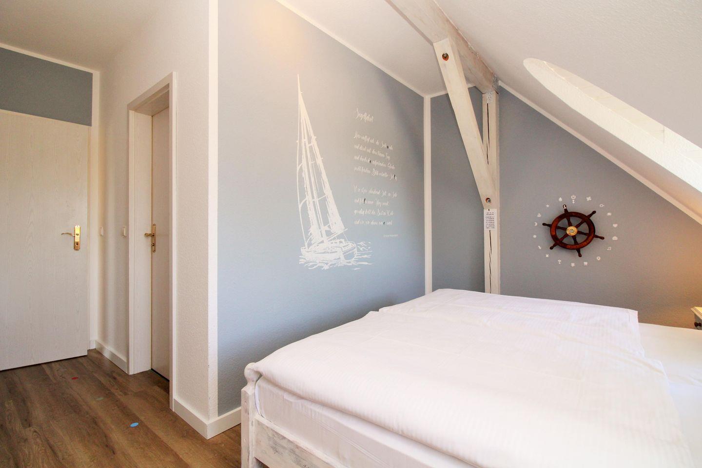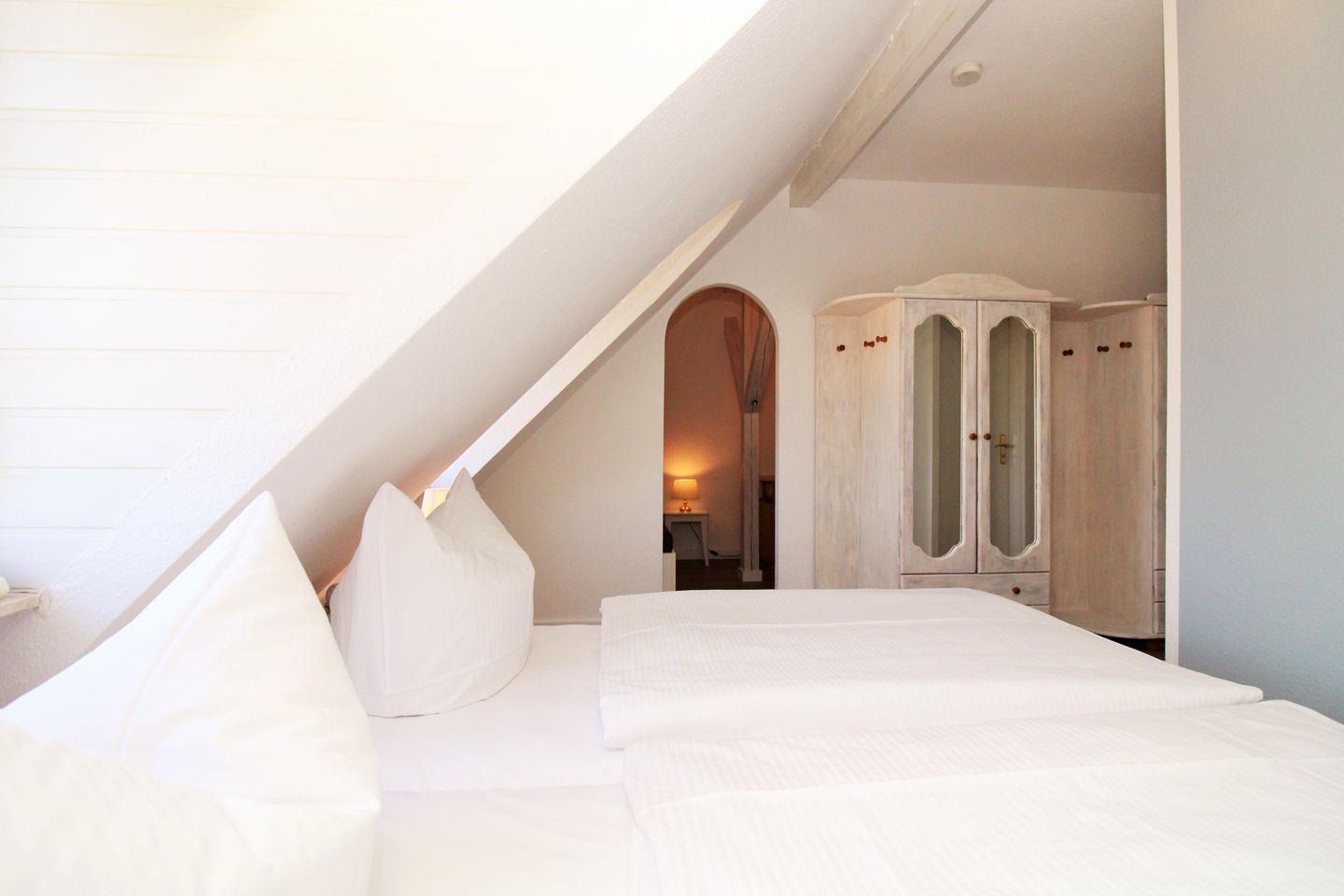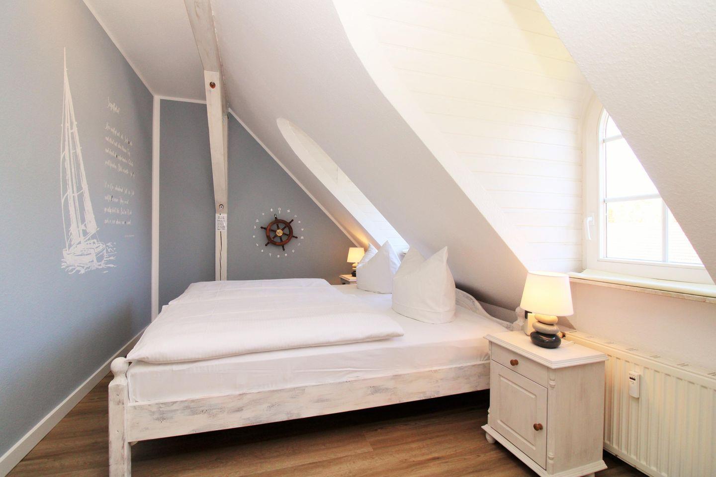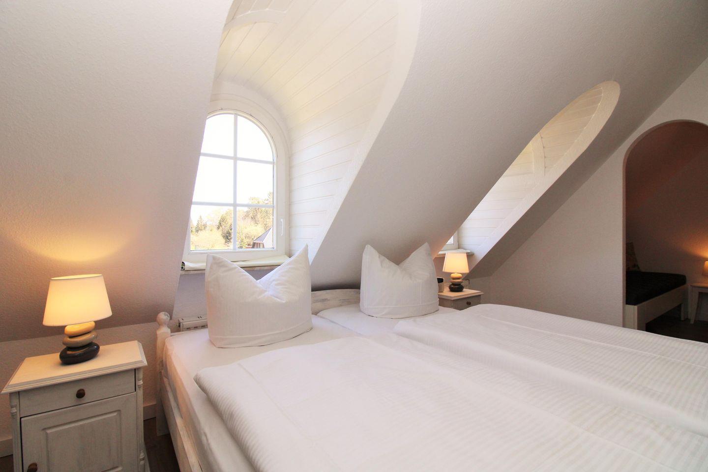 Das freundliche und gemütliche 1. Schlafzimmer ist mit einem bequemen Doppelbett mit Nachttischen sowie 2 geräumigen Kleiderschränken eingerichtet. Die zusätzlichen Verdunkelungsvorhänge an den Fenstern ermöglichen Ihnen eine ungestörte Nachtruhe. In einem vom Schlafzimmer abgehenden kleinen und offenen Raum steht eine zusätzliche Schlafcouch mit Nachttisch für eine weitere Person. Sofern hier niemand schläft, kann dieser Raum ggfs. auch als Abstellraum für Gepäck genutzt werden.