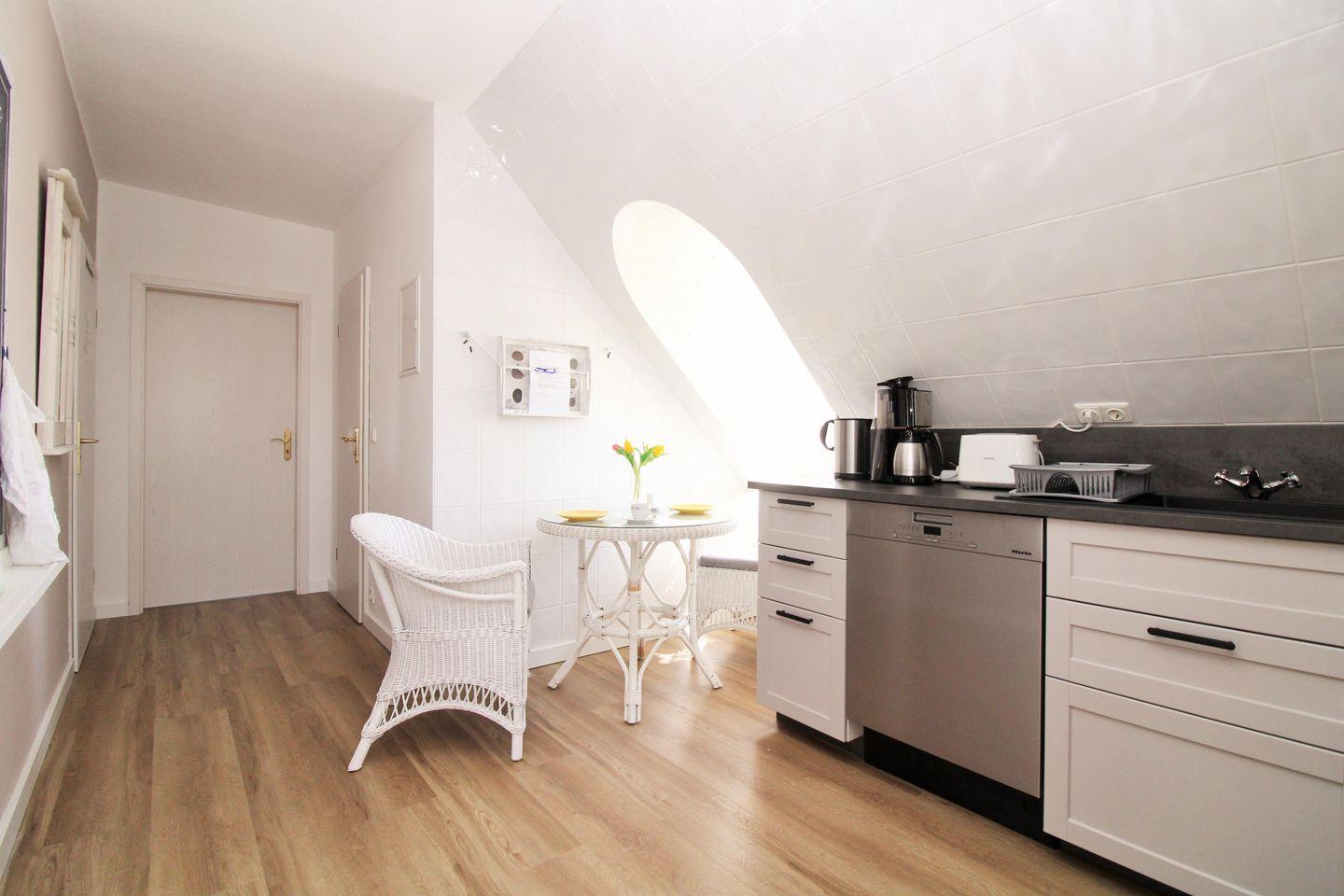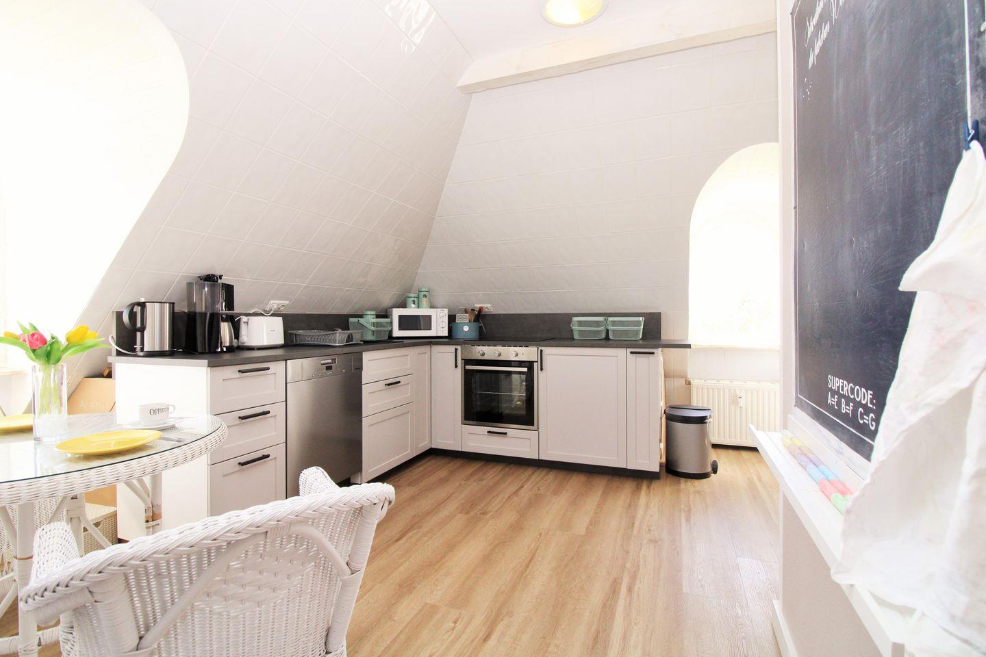 Der moderne offene Küchenbereich beinhaltet eine Einbauküchenzeile mit 4-Zonen-Ceranfeld, Backofen, Mikrowelle, Kühlschrank mit Gefrierfach, Geschirrspüler sowie Kaffeemaschine, Wasserkocher und Toaster. Die Küche ist mit Geschirr, Gläsern, Besteck und Töpfen komplett und bestens ausgestattet.