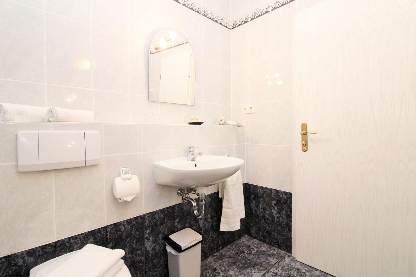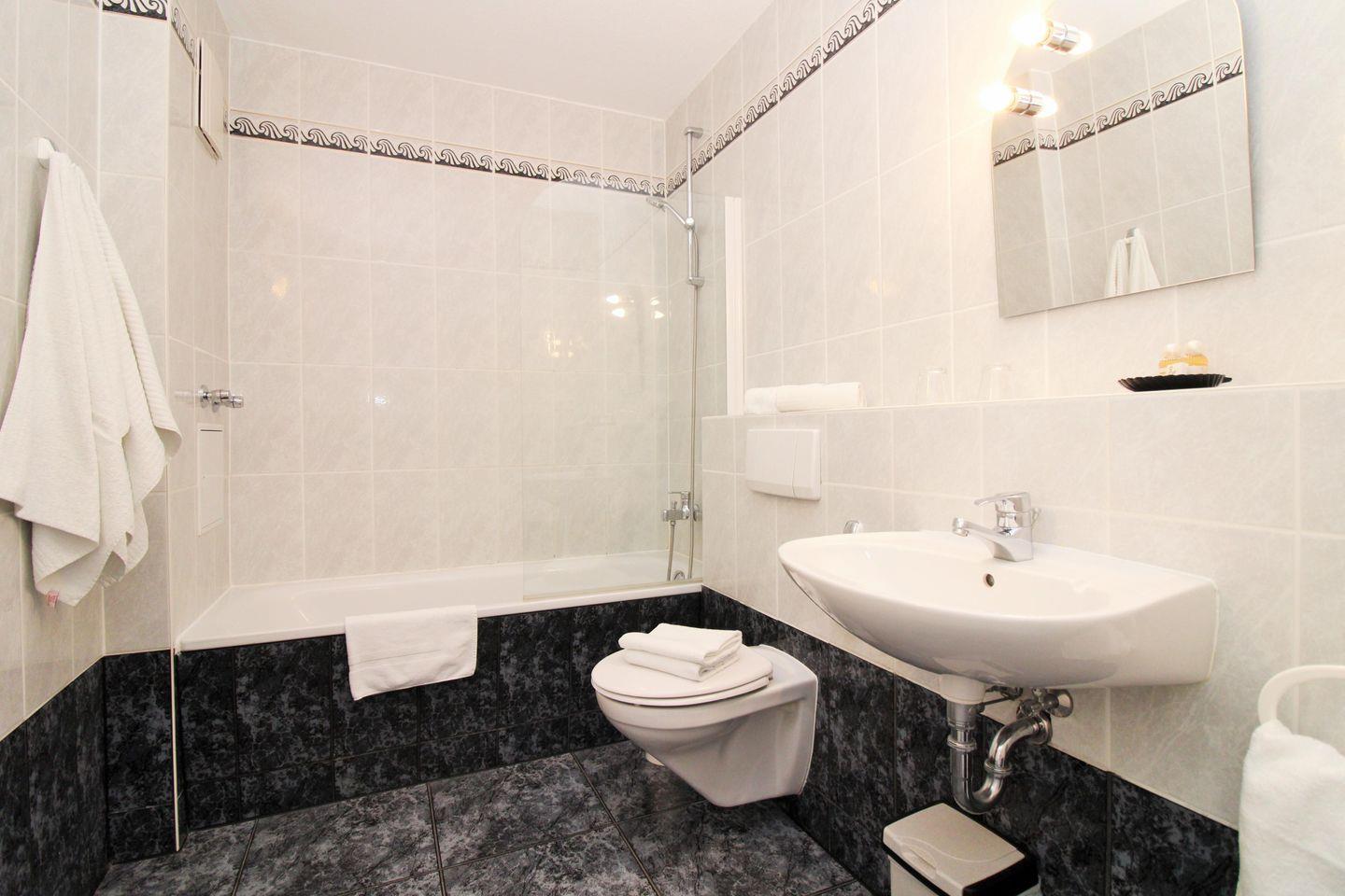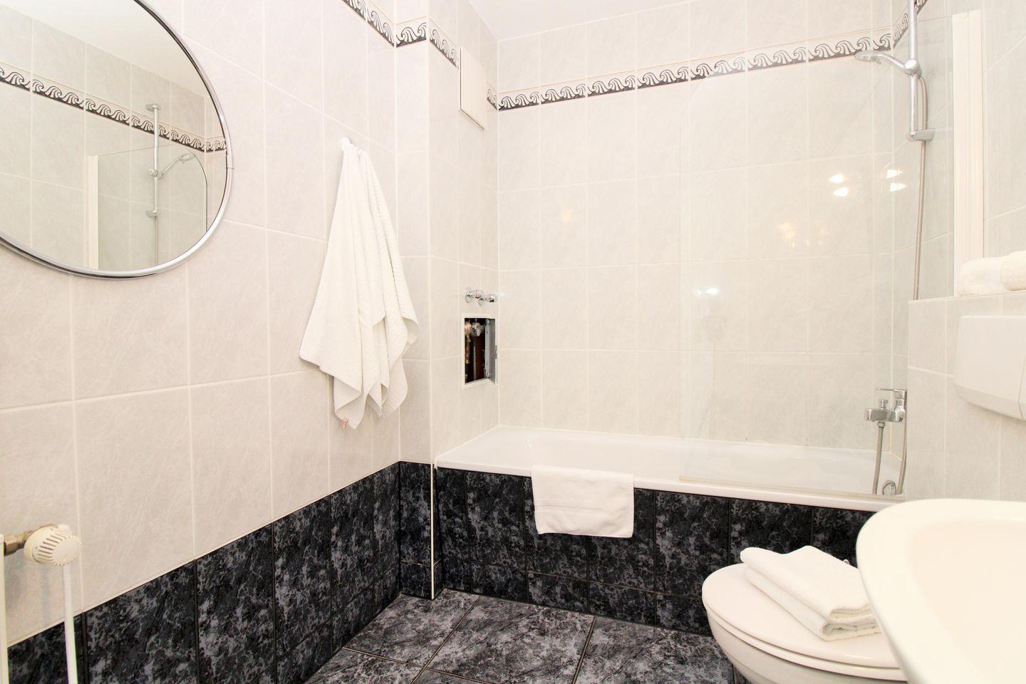 Das geräumige Badezimmer verfügt über eine Badewanne mit Echtglas-Duschabtrennung, Waschbecken mit Unterschrank, WC, einen Föhn sowie ausreichend Ablagemöglichkeiten.
