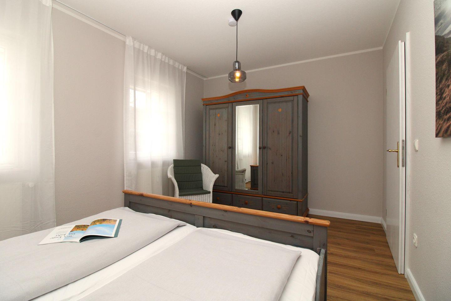 Das gemütliche Schlafzimmer ist mit einem bequemen Doppelbett, Nachttischen, einem geräumigen Kleiderschrank, einem Korbsessel sowie einem weiteren Smart-TV-Gerät eingerichtet. Für einen guten Schlafkomfort verfügt das Schlafzimmer auch über Verdunkelungsvorhänge.
