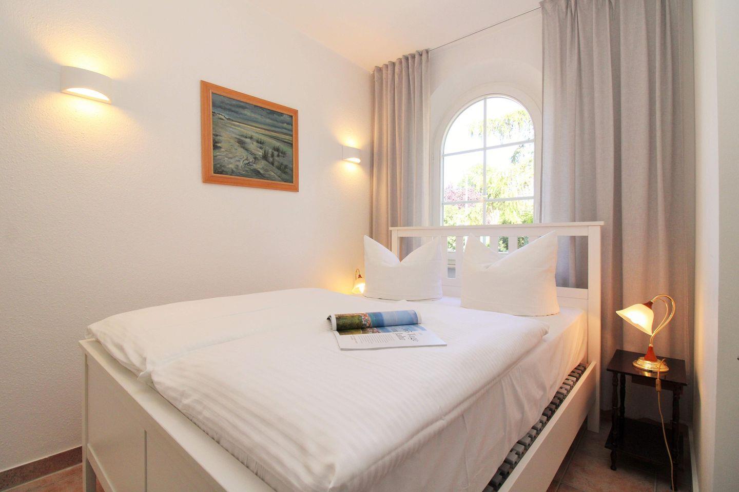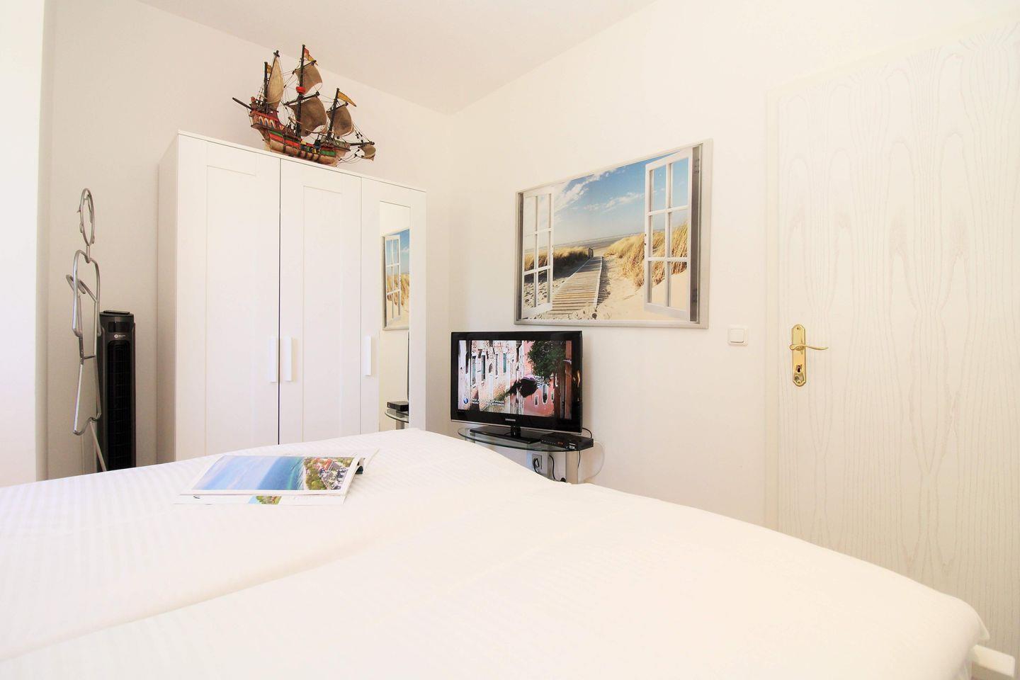 Das gemütliche und helle Schlafzimmer ist mit einem bequemen Doppelbett, Nachttischen sowie einem geräumigen Kleiderschrank eingerichtet. Hier steht Ihnen ein weiteres TV-Gerät zur Verfügung. Zusätzliche Verdunkelungsvorhänge an den Fenstern ermöglichen eine ungestörte Nachtruhe.