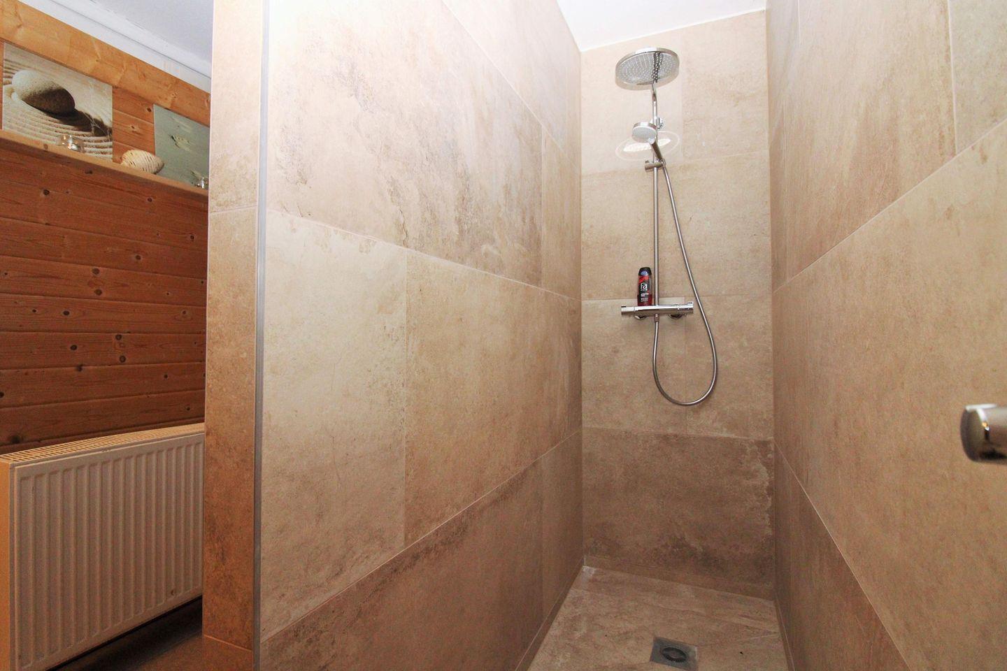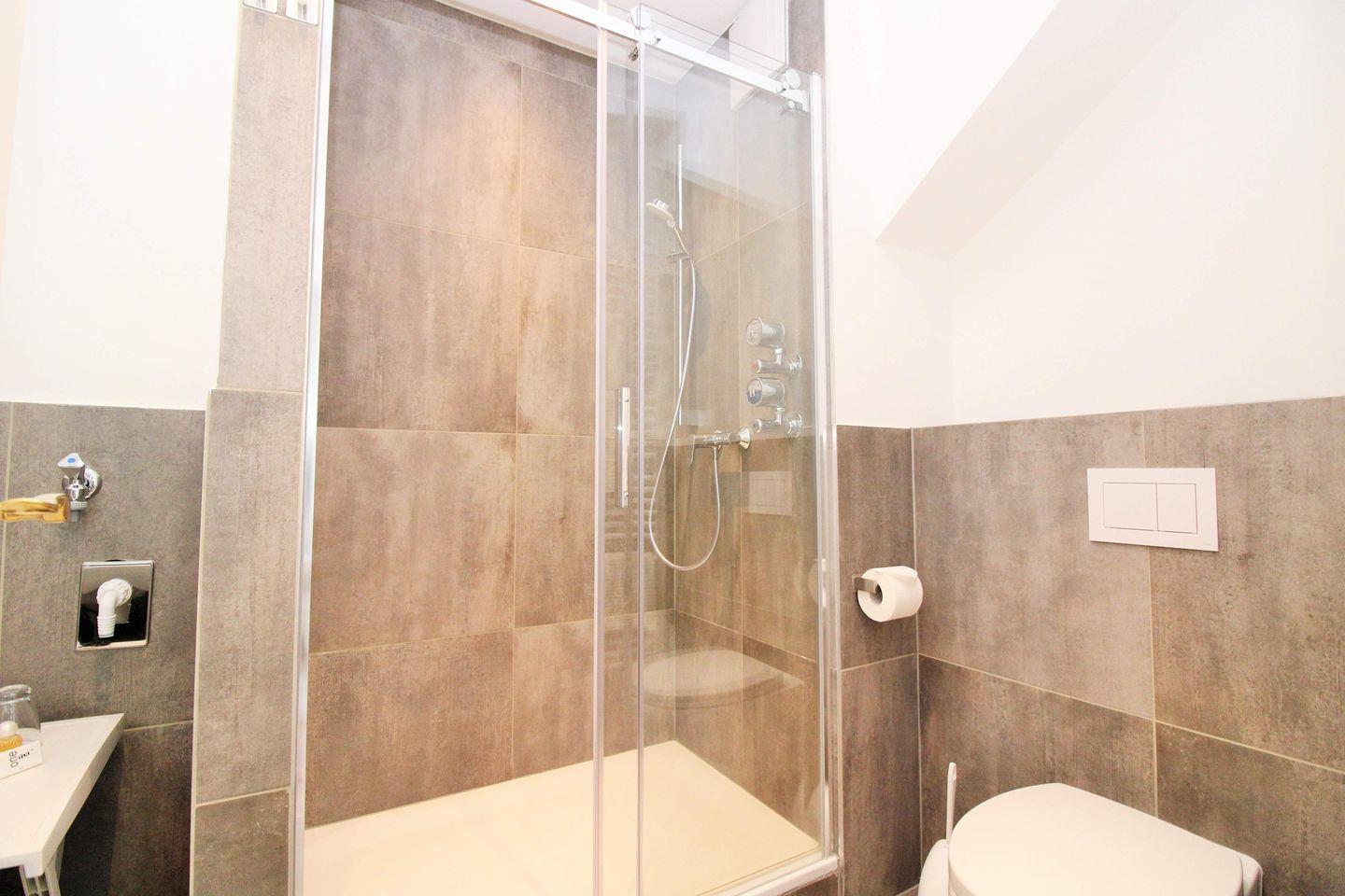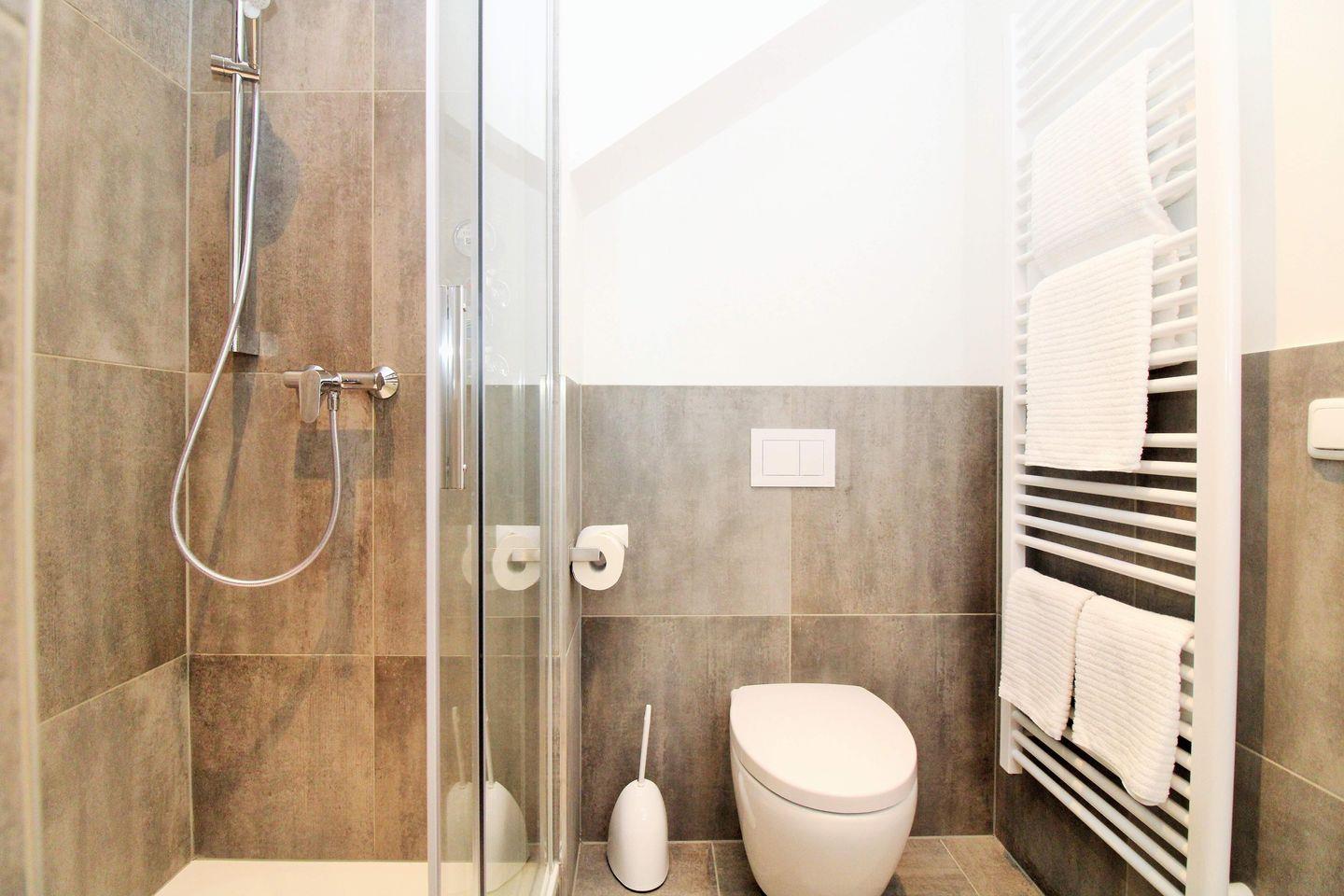 Das moderne Badezimmer verfügt über eine Dusche mit Echtglas-Duschabtrennung und niedrigem, seniorenfreundlichen Einstieg, Waschbecken, WC, einen Föhn sowie ausreichend Ablagemöglichkeiten.