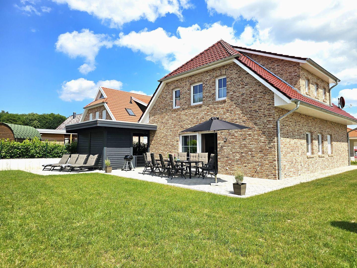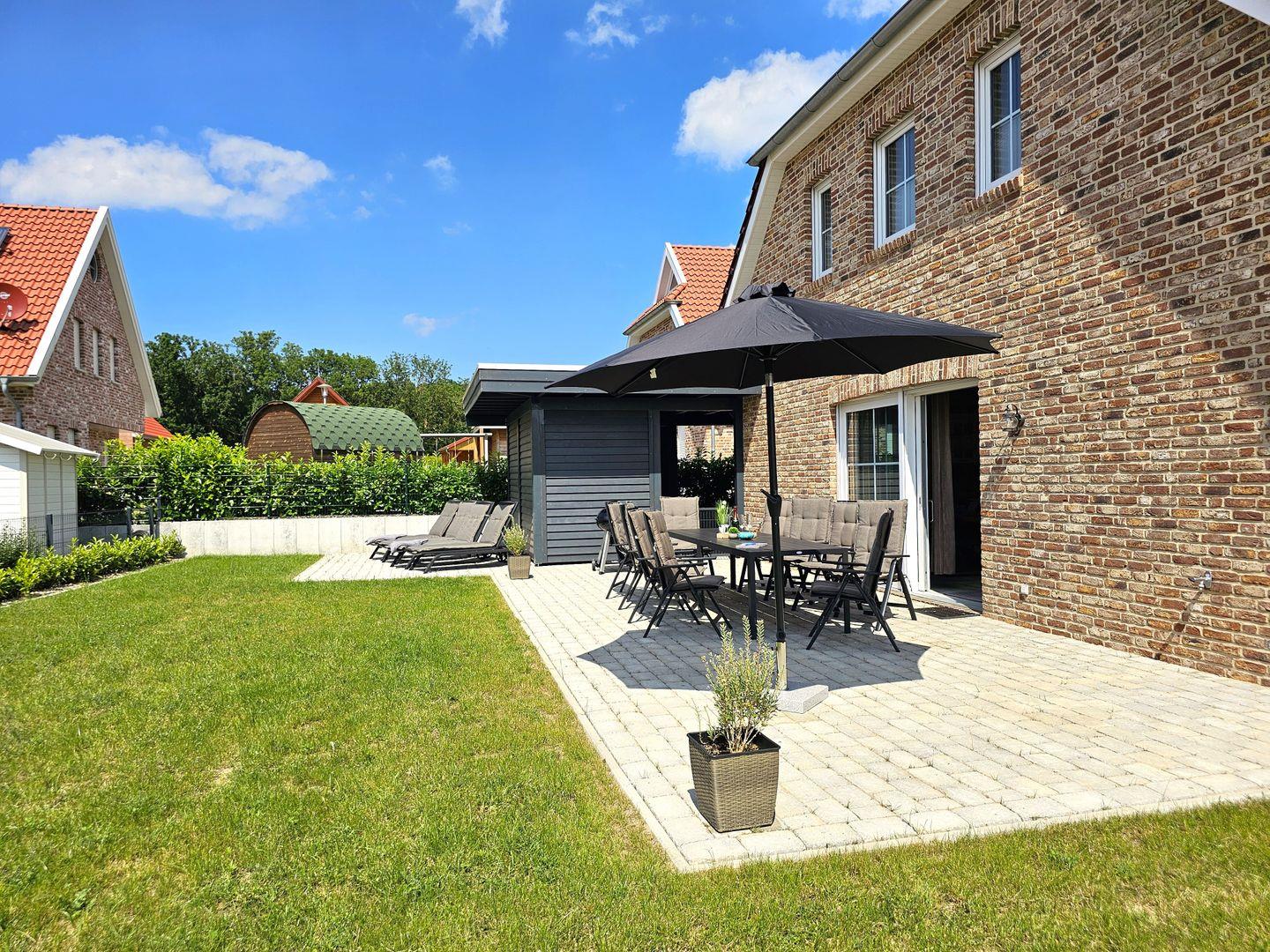 Für entspannte Stunden im Freien steht Ihnen eine schöne Terrasse mit Gartenmöbeln und Sonnenliegen zur Verfügung. Genießen Sie gemeinsame Grillabende unter freiem Himmel. Der große Garten ist komplett eingezäunt, sodass sich auch Ihr Vierbeiner frei bewegen kann.