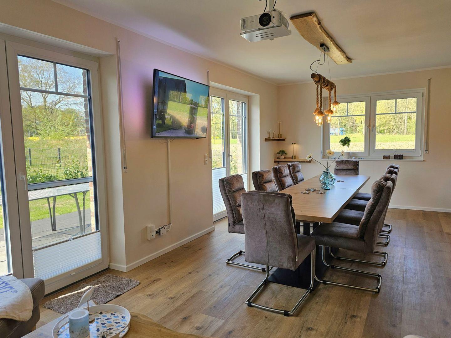 Die moderne und offene Küche des Ferienhauses ist voll ausgestattet und lässt keine Wünsche offen. Sie verfügt über einen Herd, eine Mikrowelle, einen Kühlschrank mit Gefrierfach, eine Spülmaschine, eine Doppelheißluftfriteuse, sowie zahlreiche Küchenutensilien, die Ihnen das Zubereiten von Mahlzeiten erleichtern. Der Essbereich in unmittelbarer Nähe lädt Sie ein, gemeinsam zu kochen, beisammen zu sein und zu klönen. Genießen Sie Ihre Freizeit mit den vorhandenen Spielen und Büchern oder schauen Sie einen Film auf einem der 6 Fernseher, die über Satellitenanschluss verfügen.