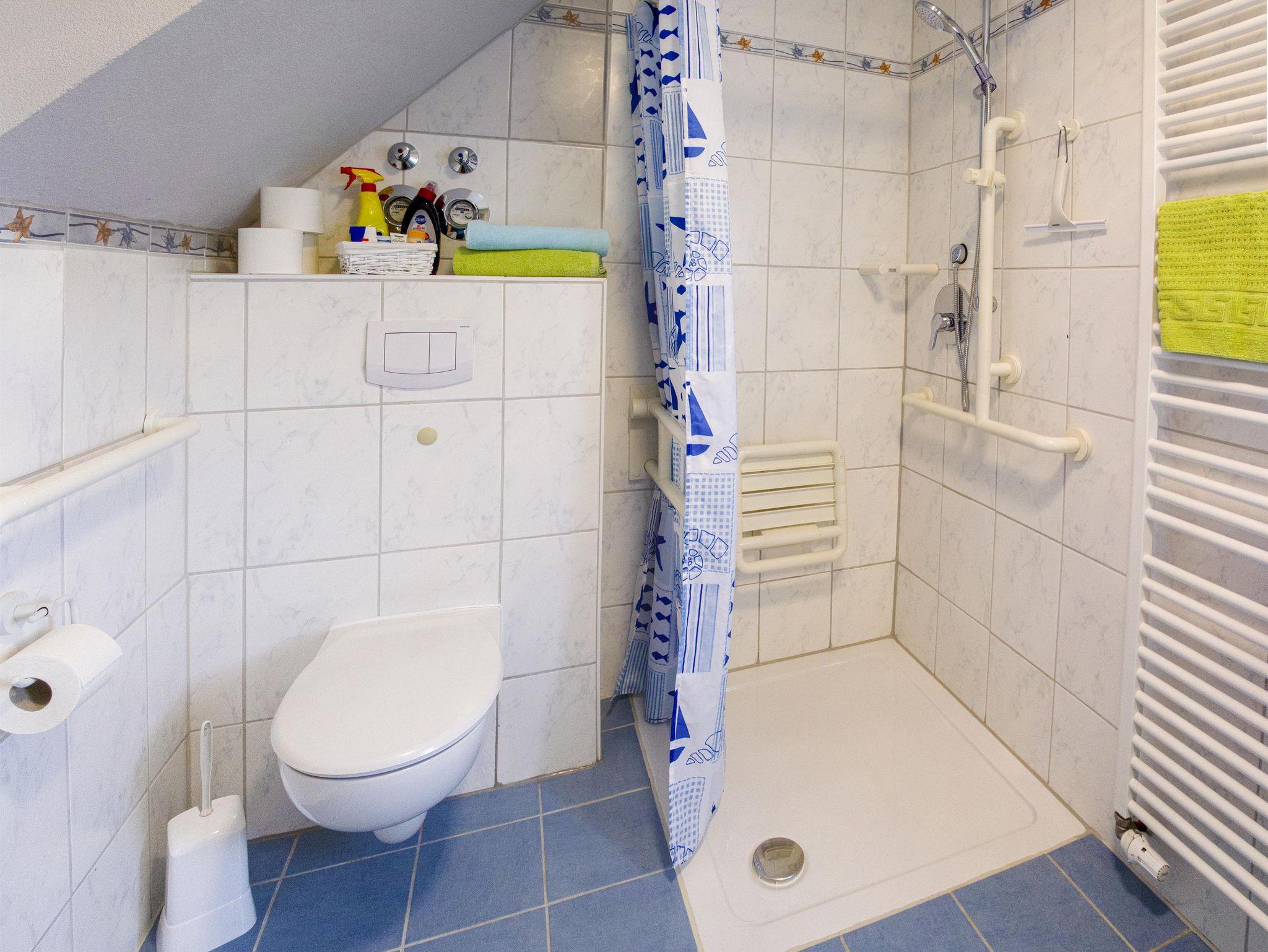 Weiterhin verfügt die Wohnung über ein behindertengerechtes Bad mit Fenster. Die barrierefreie Dusche ist mit einem Klappsitz und Haltegriffe versehen.