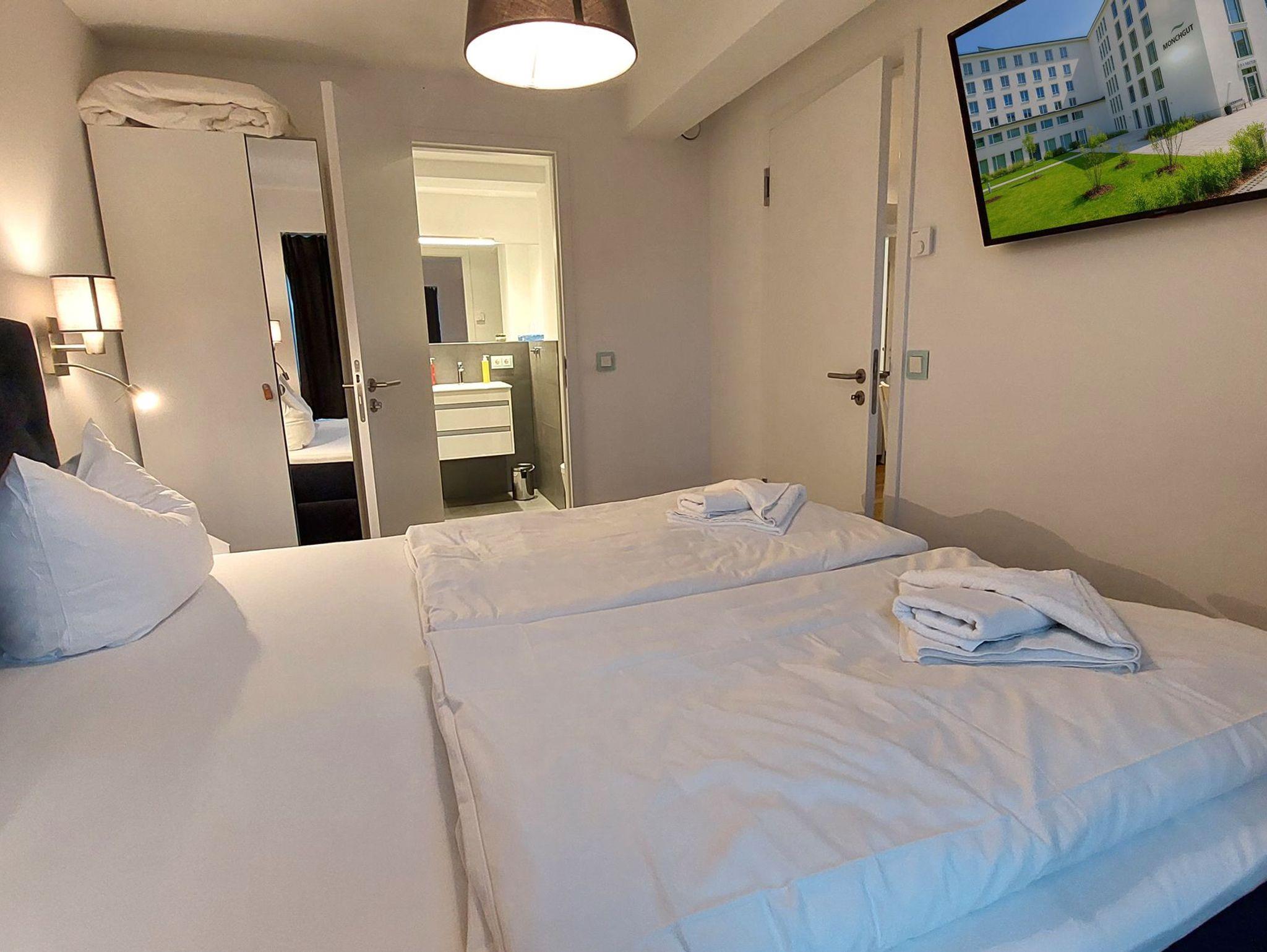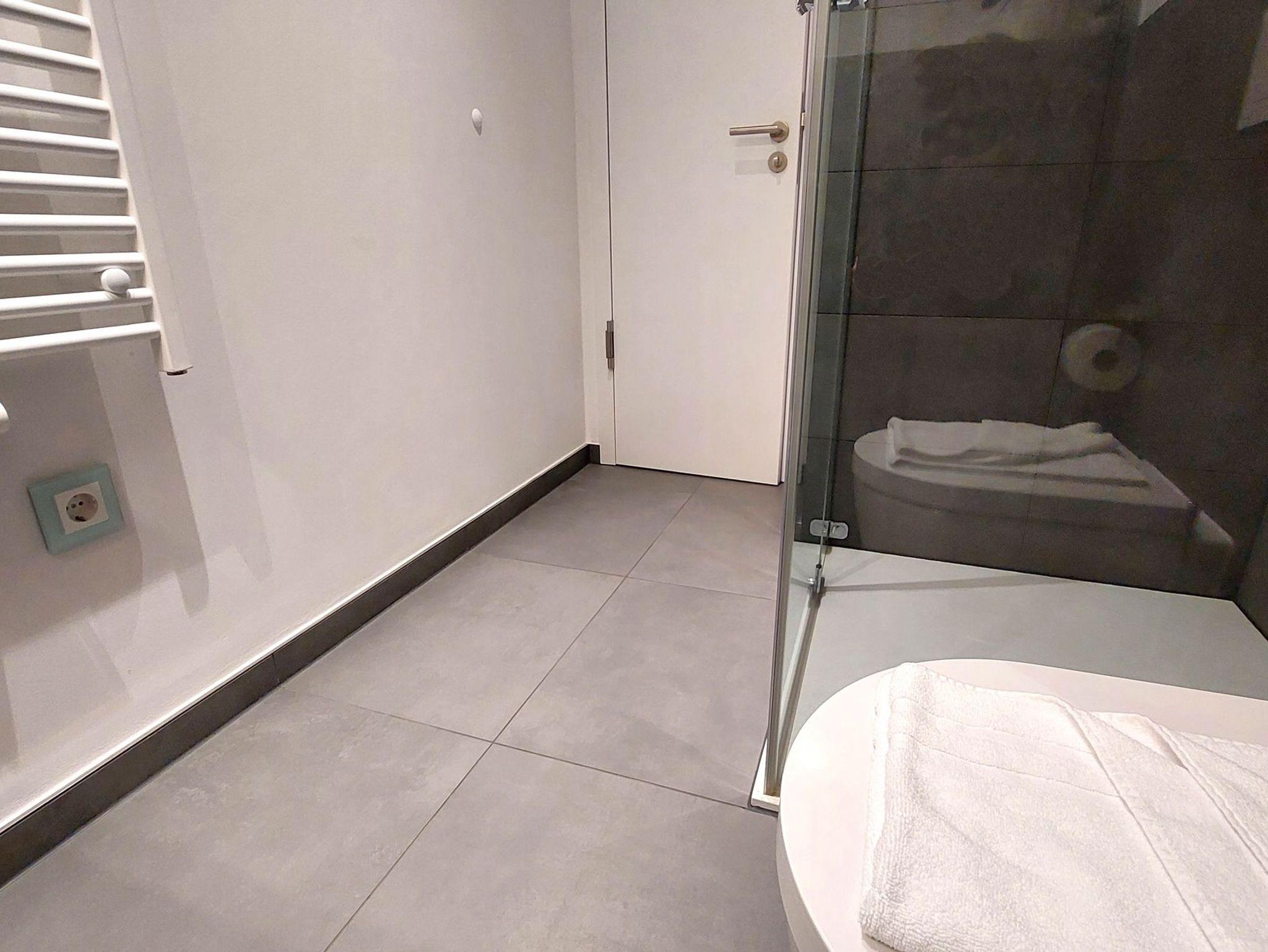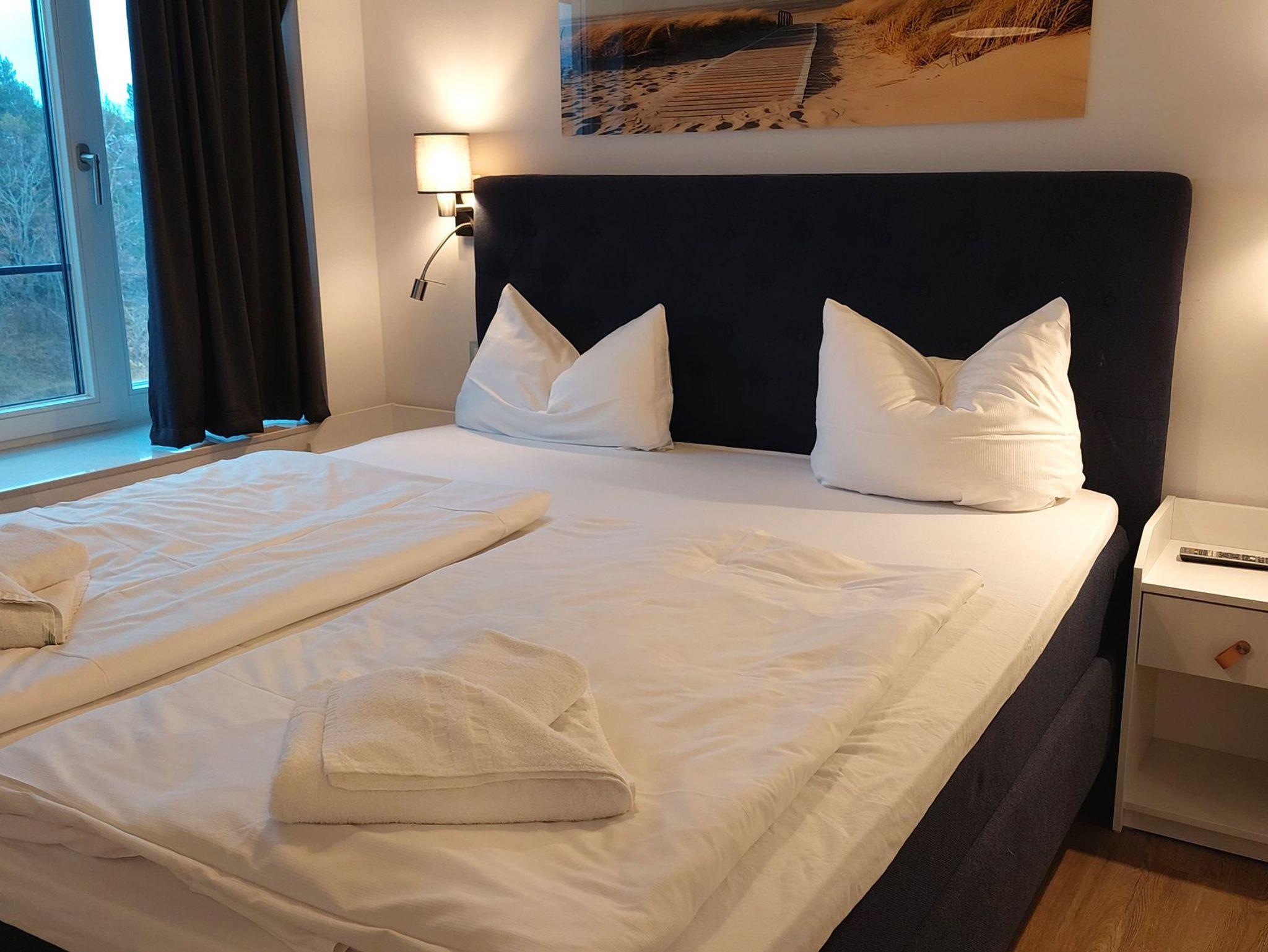 Die Wohnung verfügt über 2 vollwertige Schlafzimmer, jeweils mit einem Doppelbett, Kleiderschrank und eigenem Fernseher. Eines der Schlafzimmer hat außerdem ein eigenes Badezimmer (Bad en Suite). Das zweite Badezimmer ist ebenfalls ausgestattet mit WC, Waschtisch und ebenerdiger Dusche.