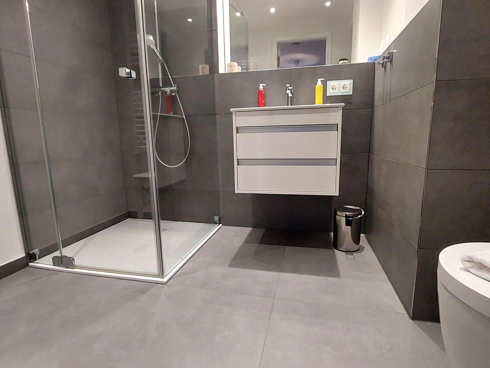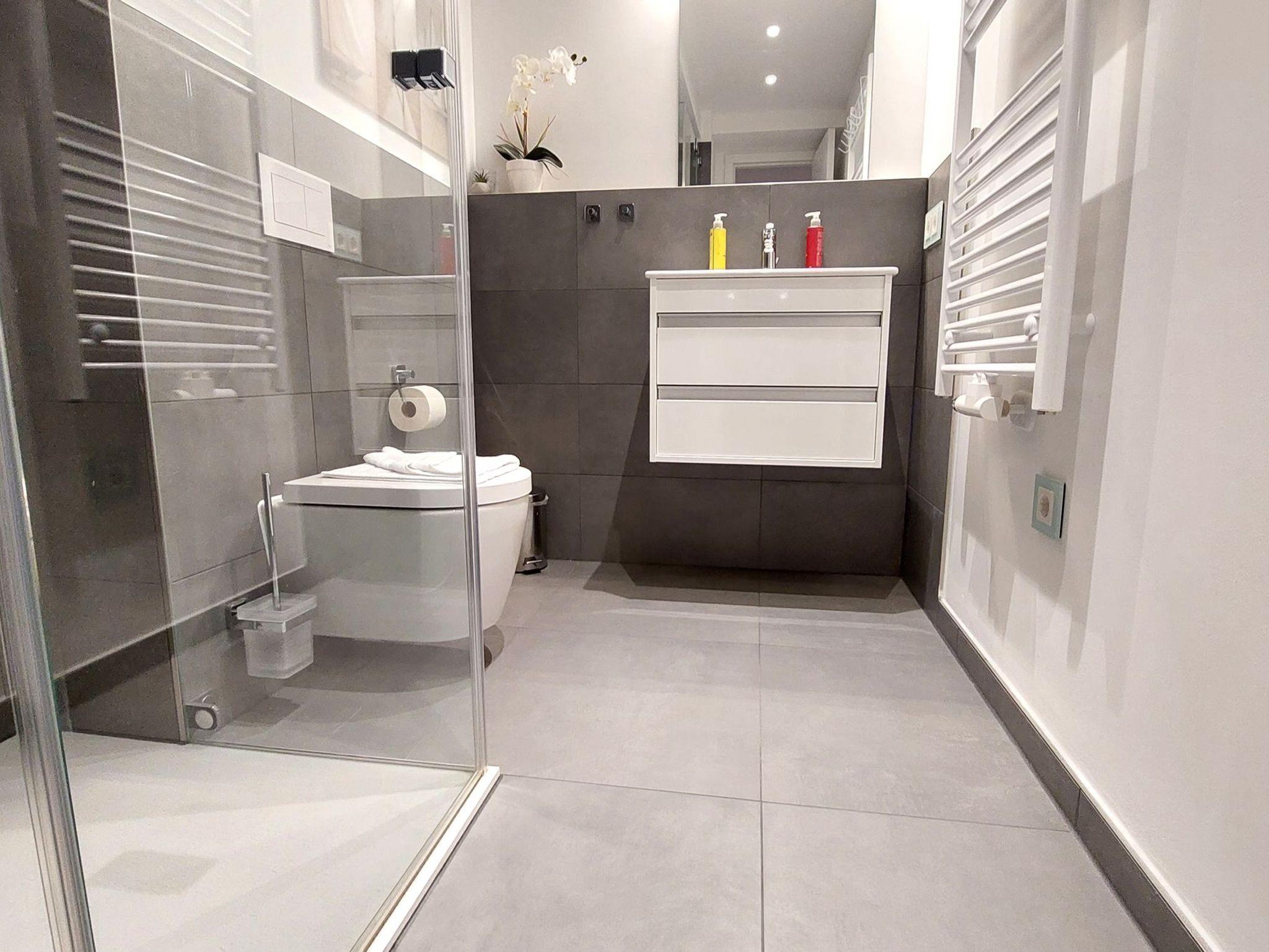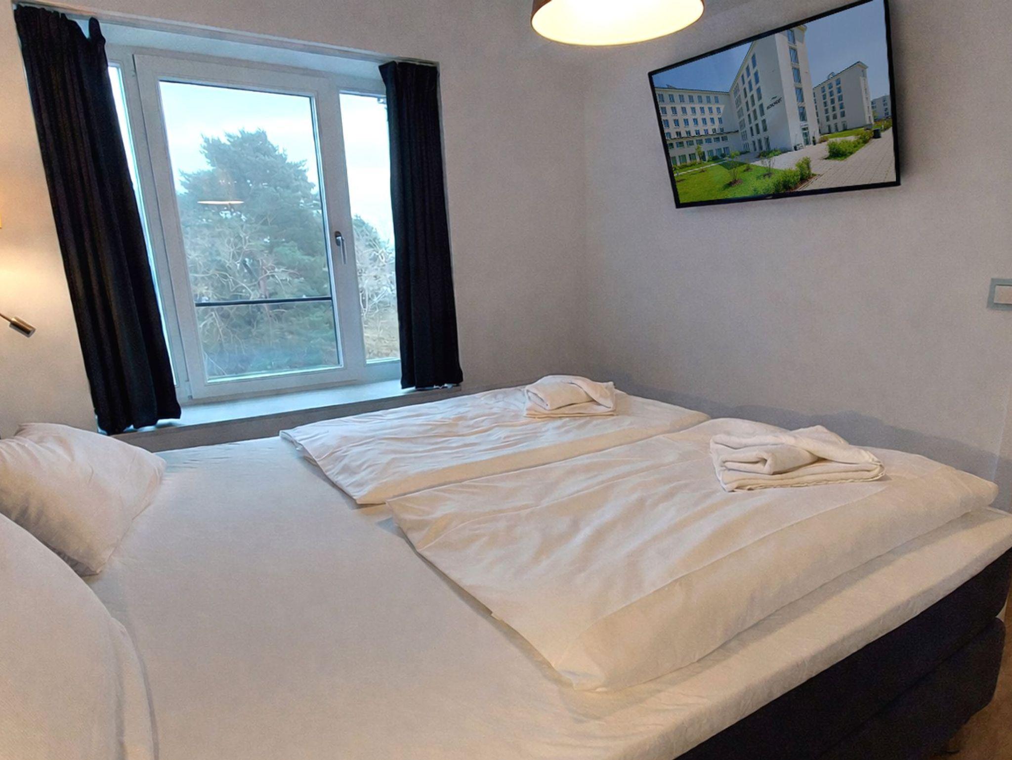 Die Wohnung verfügt über 2 vollwertige Schlafzimmer, jeweils mit einem Doppelbett, Kleiderschrank und eigenem Fernseher. Eines der Schlafzimmer hat außerdem ein eigenes Badezimmer (Bad en Suite). Das zweite Badezimmer ist ebenfalls ausgestattet mit WC, Waschtisch und ebenerdiger Dusche.