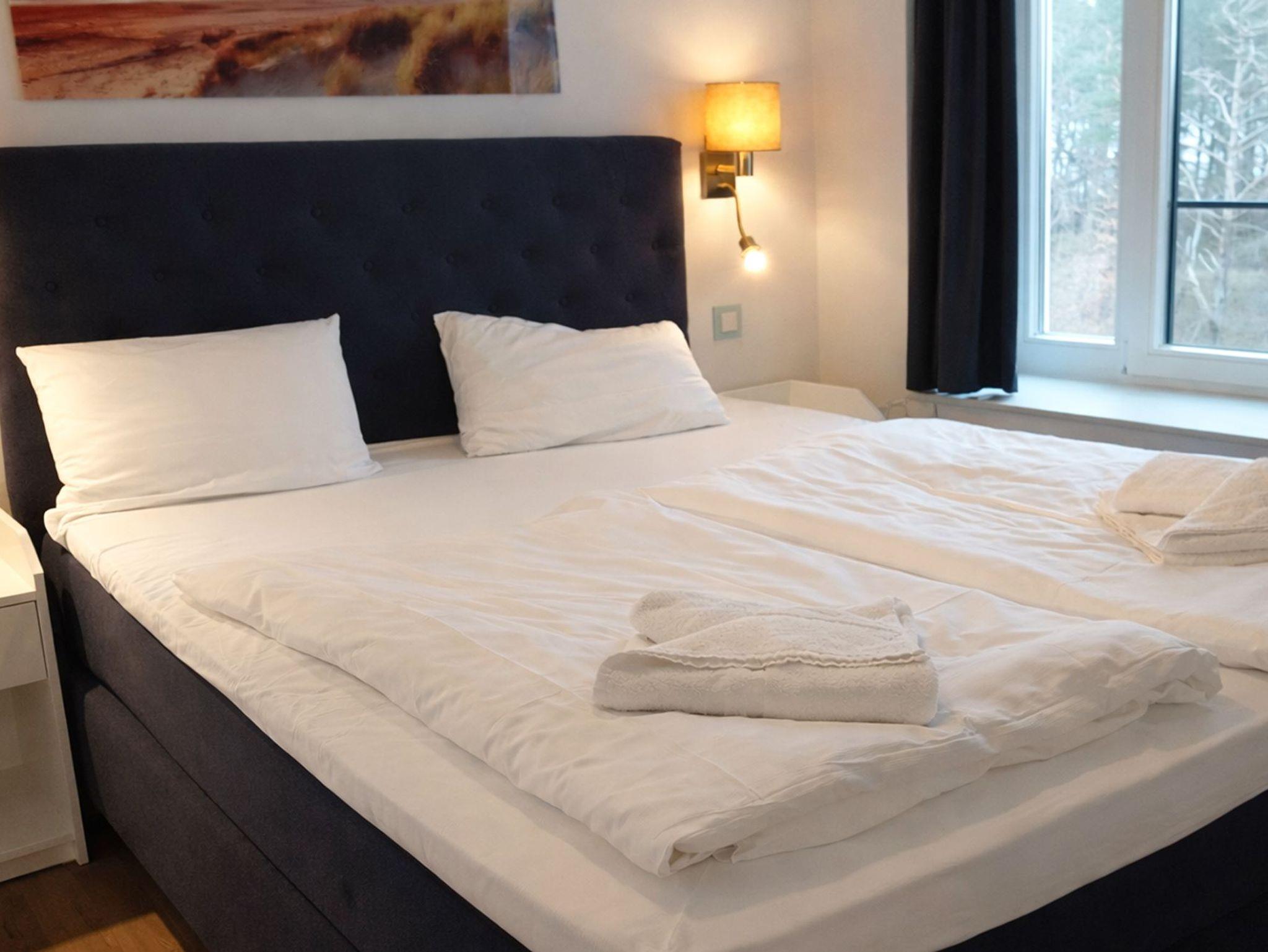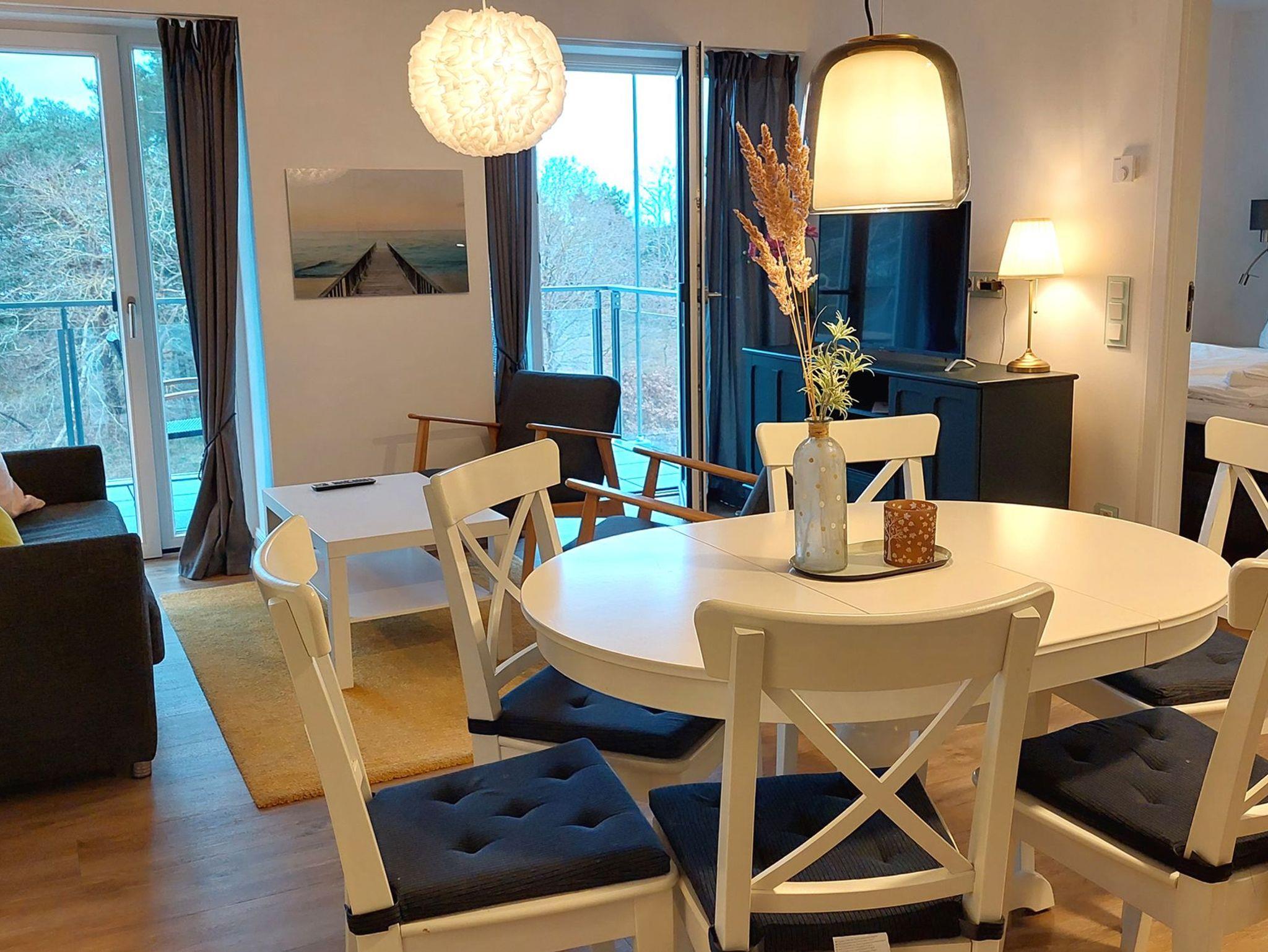 Das Wohn- und Esszimmer ist das Zentrum der Wohnung und lädt mit einer ausklappbaren Sofalandschaft zum Entspannen ein. Für Unterhaltung bei jedem Wetter gibt es einen Smart-TV und kostenfreies WLAN. Der Essbereich bietet Platz für 6 Personen und vom möblierten und überdachten Balkon aus hat man einen Blick auf den angrenzenden Küstenwald und die Ostseedünen.