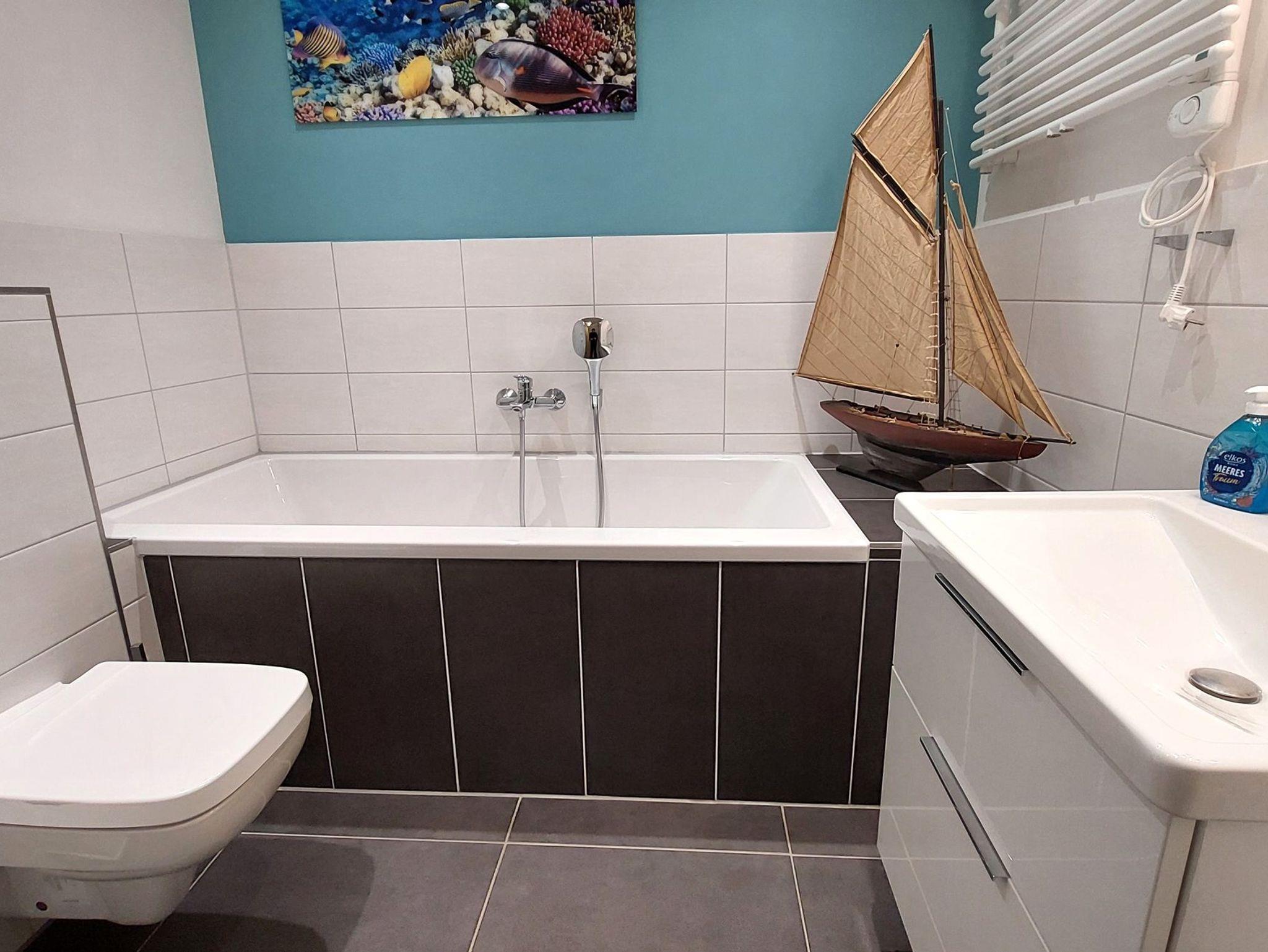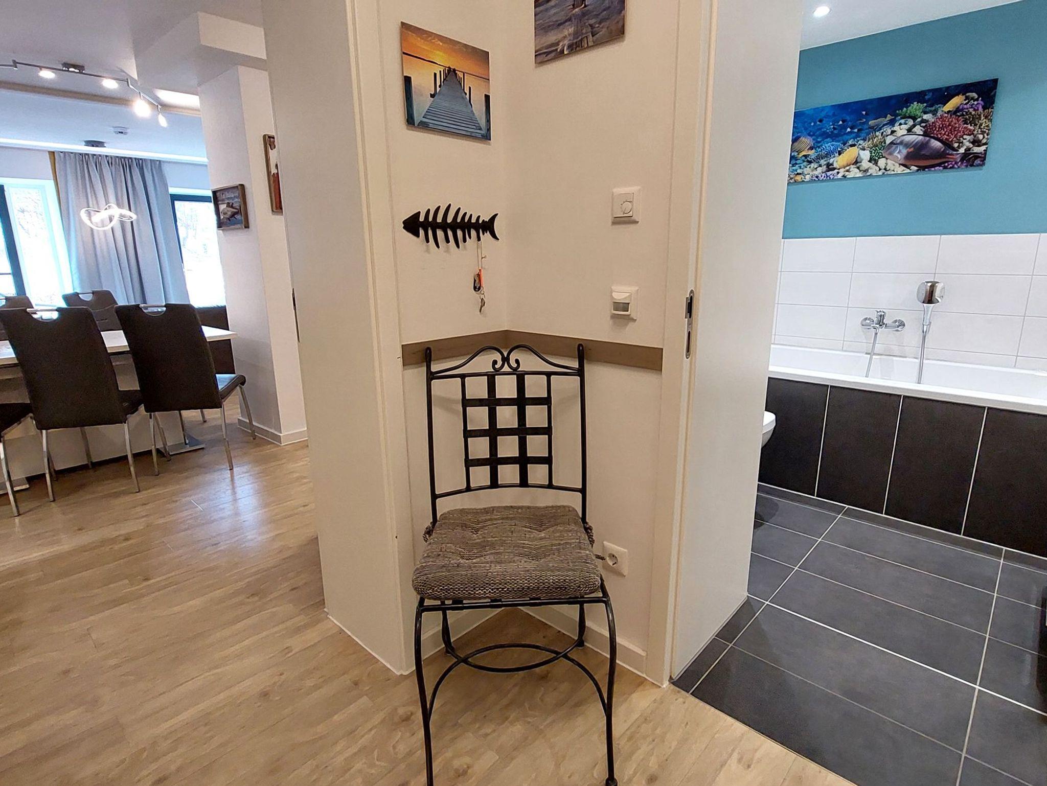 Der Eingangsbereich samt Garderobe bietet Zugang zum ersten Badezimmer, welches mit mit WC, Waschbecken und Badewanne ausgestattet ist.