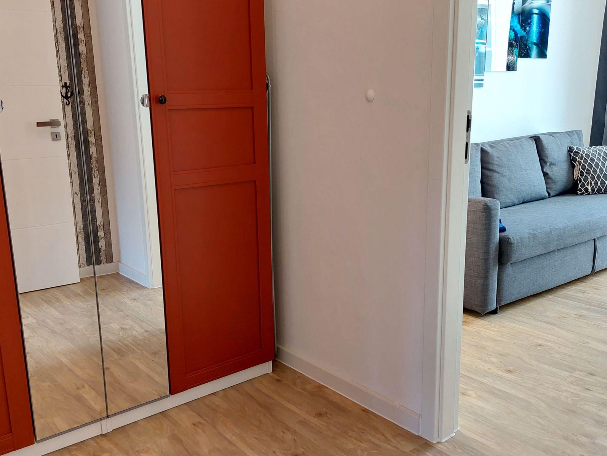 Es gibt einen großen Kleiderschrank mit viel Stauraum im Vorflur der beiden kleinen Schlafzimmer. Diese bieten jeweils ein Schlafsofa, wobei das landseitige Zimmer über einen zusätzlichen Smart-TV und eine eigene kleine Terrasse verfügt.